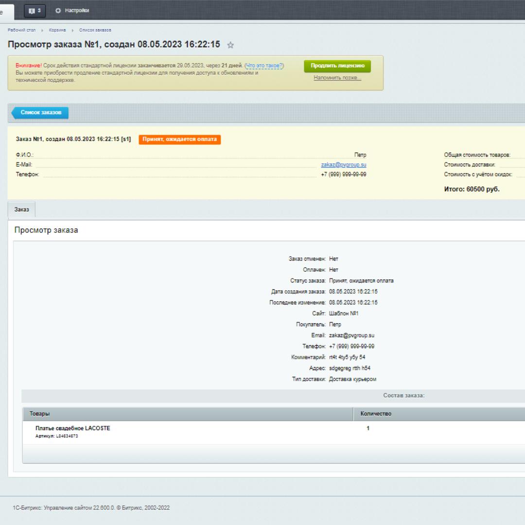 - Уведомление о новом заказе на e-mail администратору.