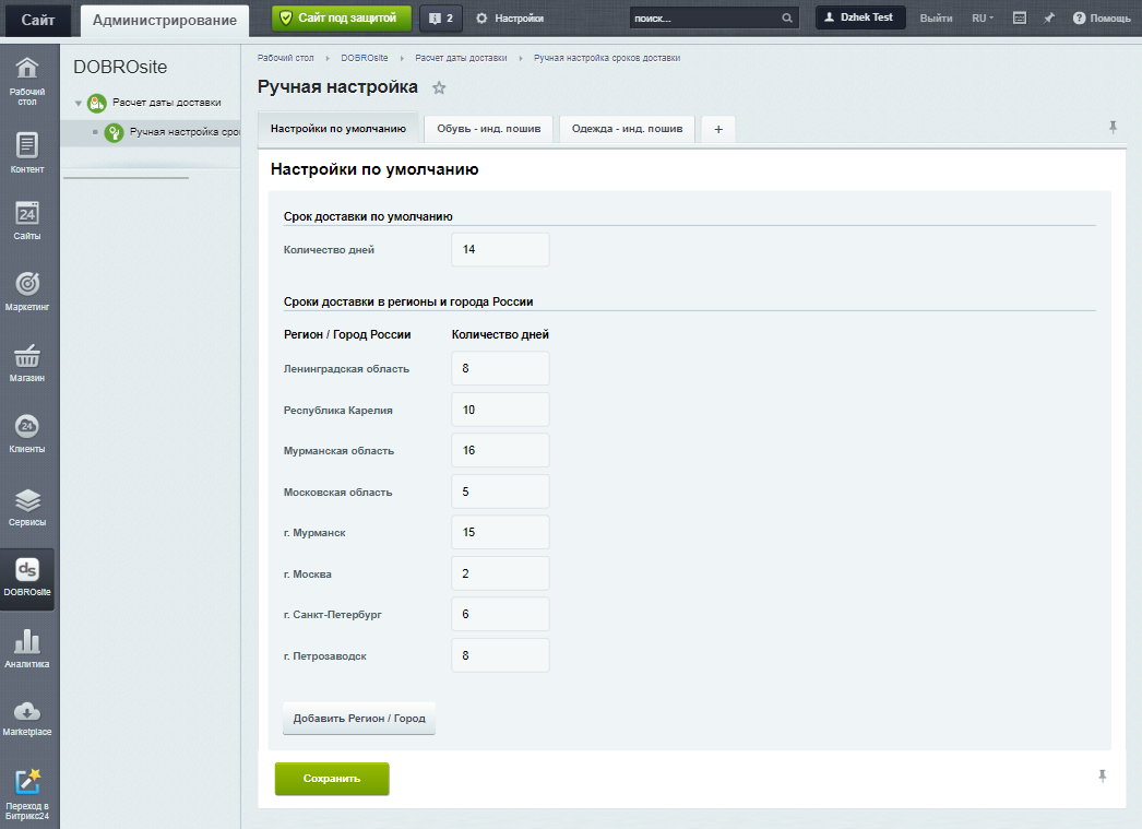 В настройках модуля предусмотрена возможность указать время доставки (в днях) вручную для регионов и городов России для всего каталога, либо для какой-то группы товаров каталога.