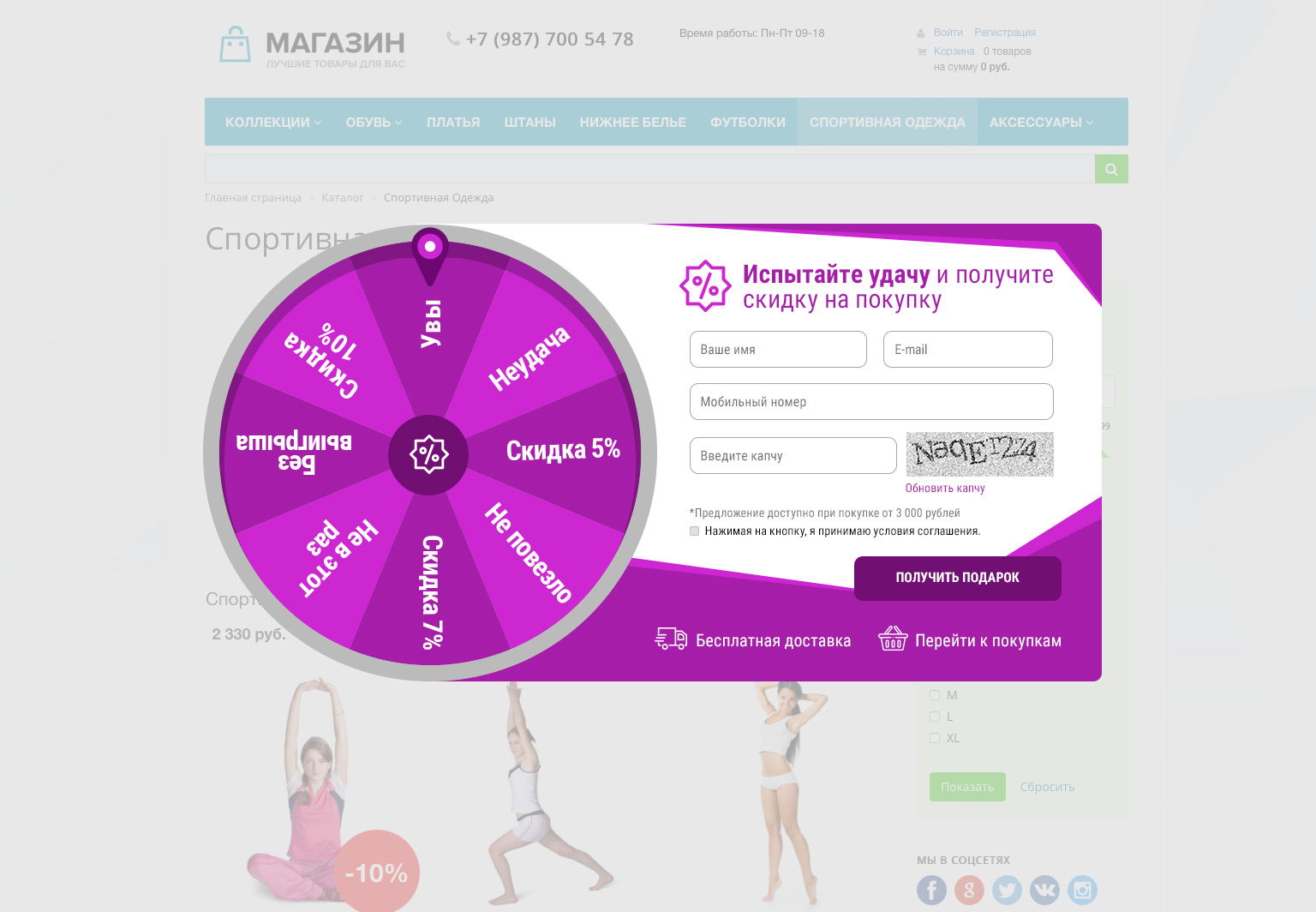| Модальное (popup) окно с Колесом Фортуны Через интервал времени или при наборе определенной суммы товаров в корзине | Купон на скидку, подарок или бесплатную доставку // // | Регистрация пользователя Еще один способ регистрации посетителей с мотивацией на покупку | |||||||