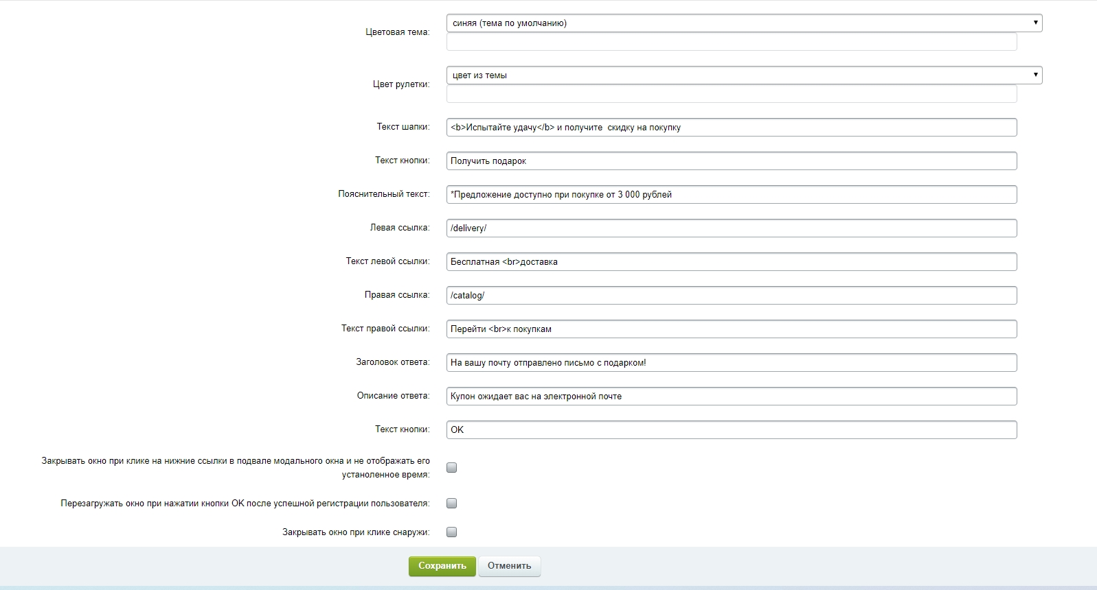 Сценарий прост: посетитель заполняет форму, рулетка запускается и выигрыш отправляется в виде купона, который сгенерировал наш модуль, на указанный e-mail адрес зарегистрировавшегося пользователя. Это также может побудить покупателя в тот же момент выполнить заказ. Так или иначе, у Вас останется «частица» вашего клиента, которому всегда можно напомнить об интересных акциях и предложениях.
