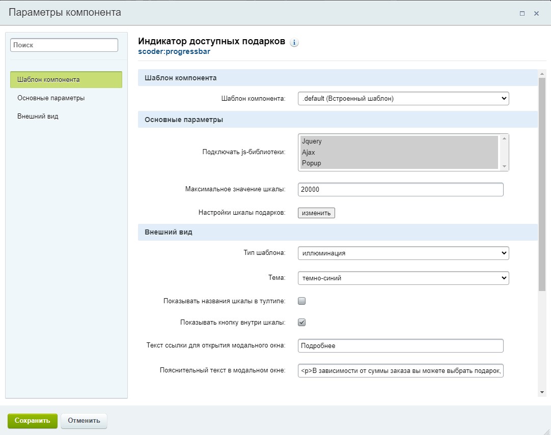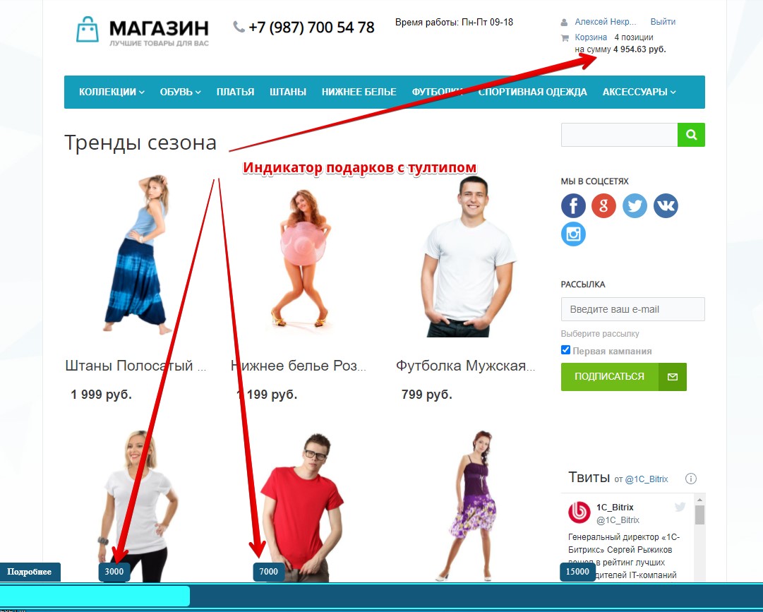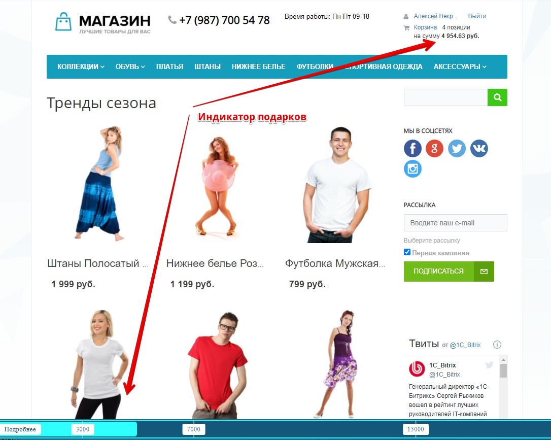 - Модуль не предоставляет какие-либо подарки или скидки самостоятельно, а лишь выводит информационное табло, согласно заданным параметрам компонента. Чтобы ваши настройки (обещанные подарки или скидки) соответствовали действительности, то необходимо обязательно настроить правила работы с корзиной, т.е. для предоставления скидок необходимо использовать стандартный товарный маркетинг 1С-Битрикс. Управление сайтом.
