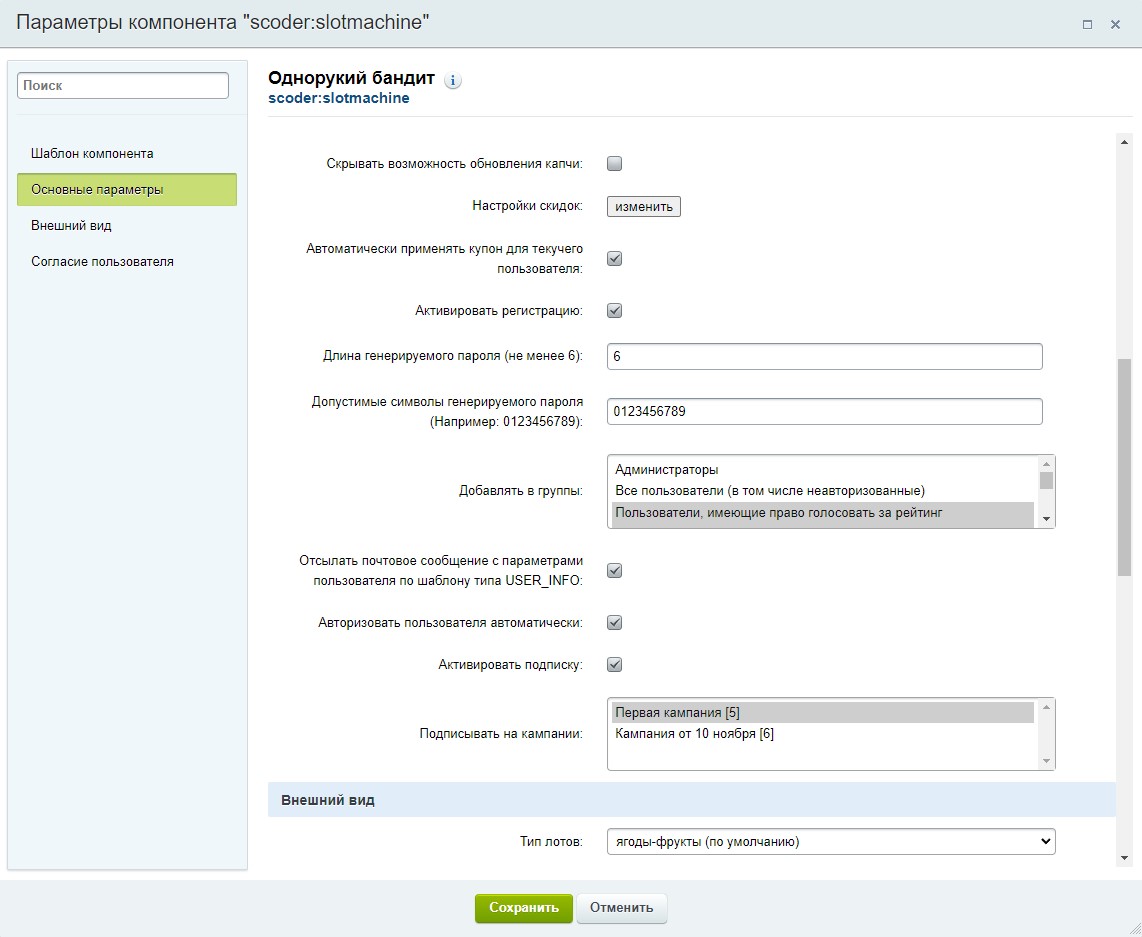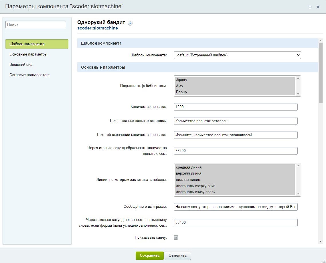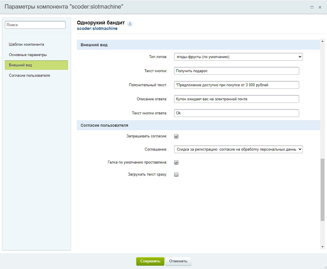 Модуль содержит компонент, который выводит слотмашину, в которую посетитель может поиграть и выиграть купон на скидки, какие Вы настроите. Слотмашина - это аналог игрового автомата.