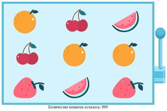 - Посетитель запускает машину, нажимая на рукоять. Запускать можно множество раз, пока не закончится количество попыток или не выиграет, и не заполнит форму для получения промокода.