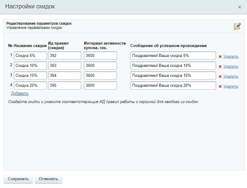 - Возможно задать разную величину скидки с помощью правил работы с корзиной для каждого слота (фрукта, ягоды или цифры)