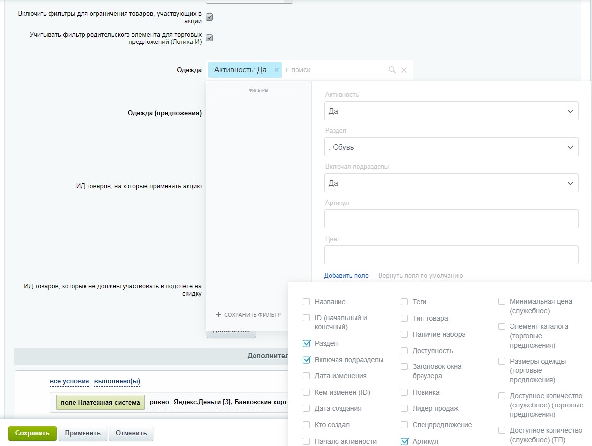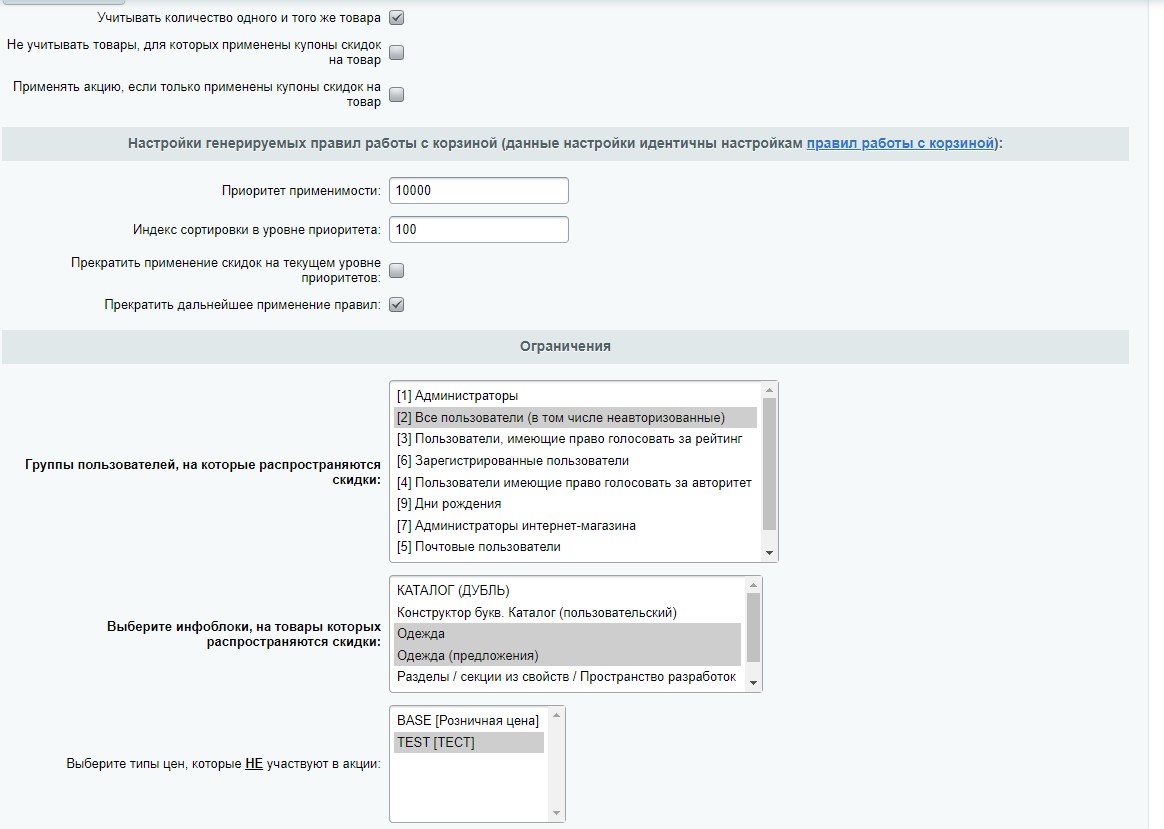 Скидки Возможность задавать скидки как в процентах, так и фиксированно. | Гибкие настройки Ограничения товаров, участвующих в акции по множеству параметров: разделам, полям, свойствам | |