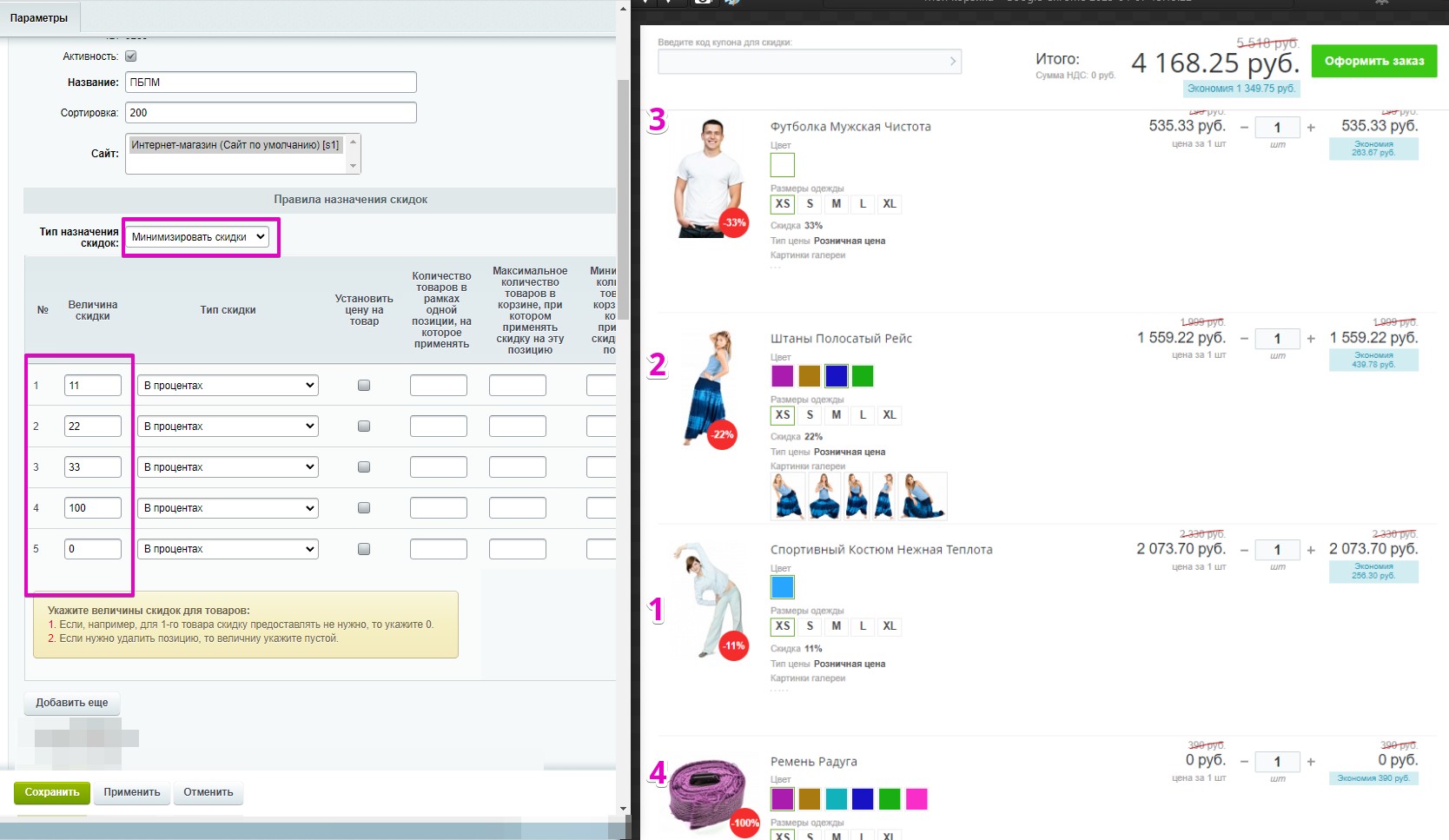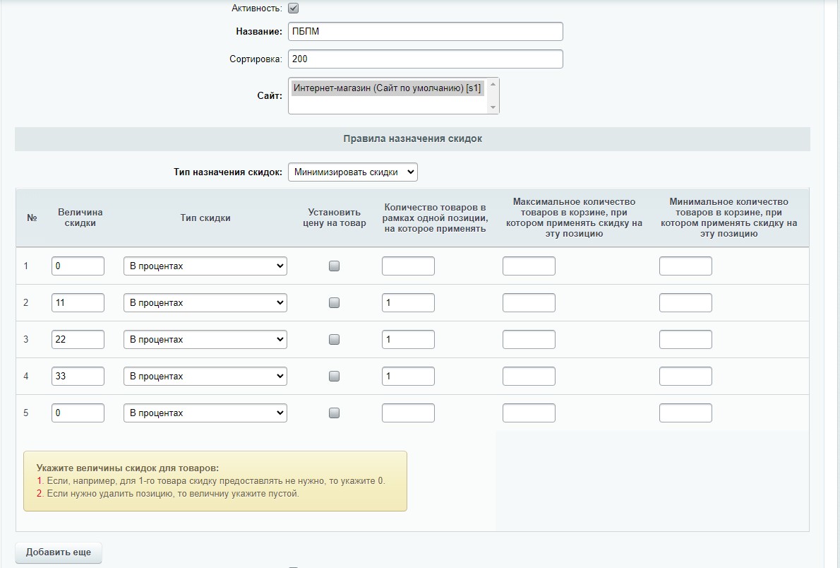 Возможность задавать различную величину скидок с учетом количества позиций (тоаров) в корзине. Модуль обладает широким набором настроек, что позволит легко реализовать следующие маркетинговые приёмы.