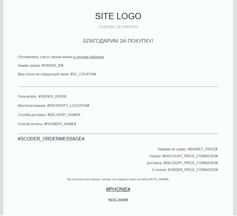| #PROPERTY_<КОД_СВОЙСТВА_ЗАКАЗА># | Значения свойств заказа. Например: PROPERTY_EMAIL PROPERTY_PHONE PROPERTY_LOCATION PROPERTY_CITY PROPERTY_ADDRESS | |||