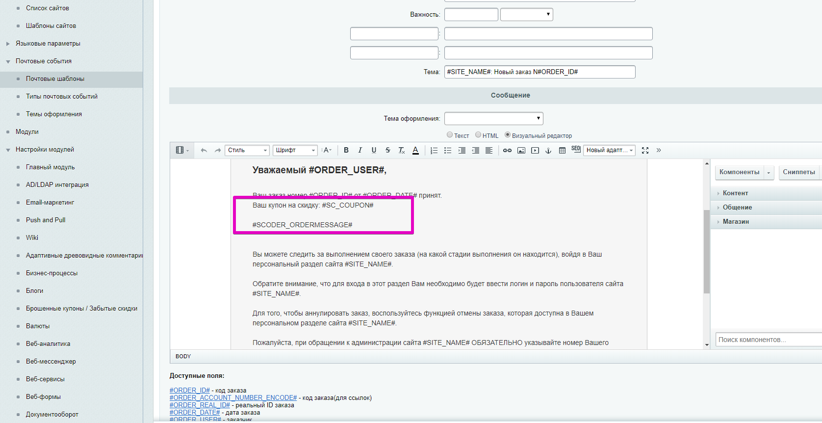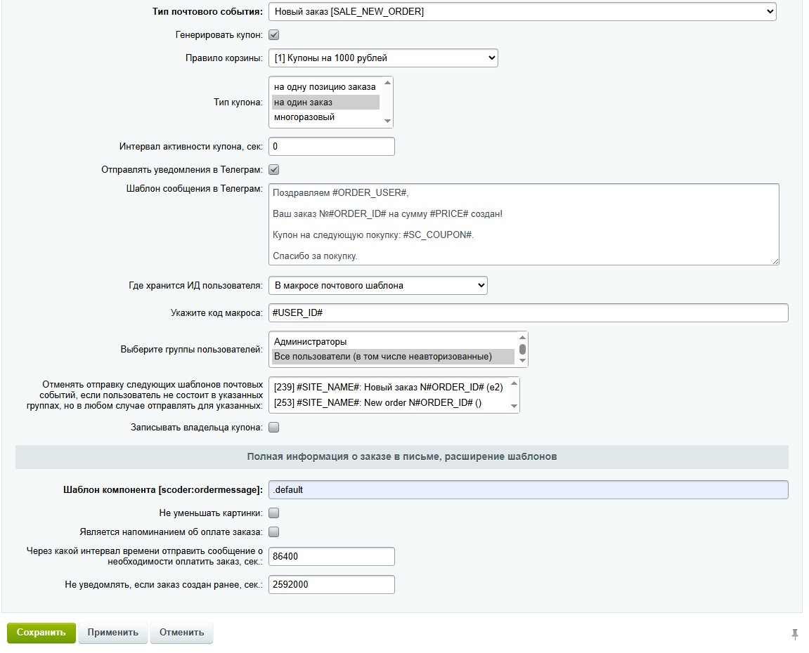 | Любые вручную созданные почтовые события с префиксом SCODER_ORDERMESSAGE_. | |