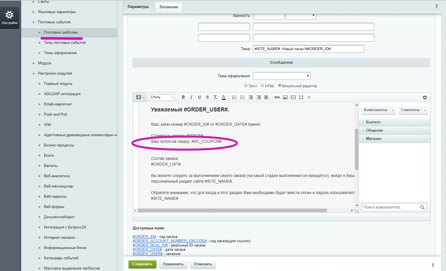 | В почтовых шаблонах выбранного почтового события в нужном месте указать специальную переменную (макрос) #SC_COUPON# и посетитель получит купон на скидку, подарок или бесплатную доставку. |