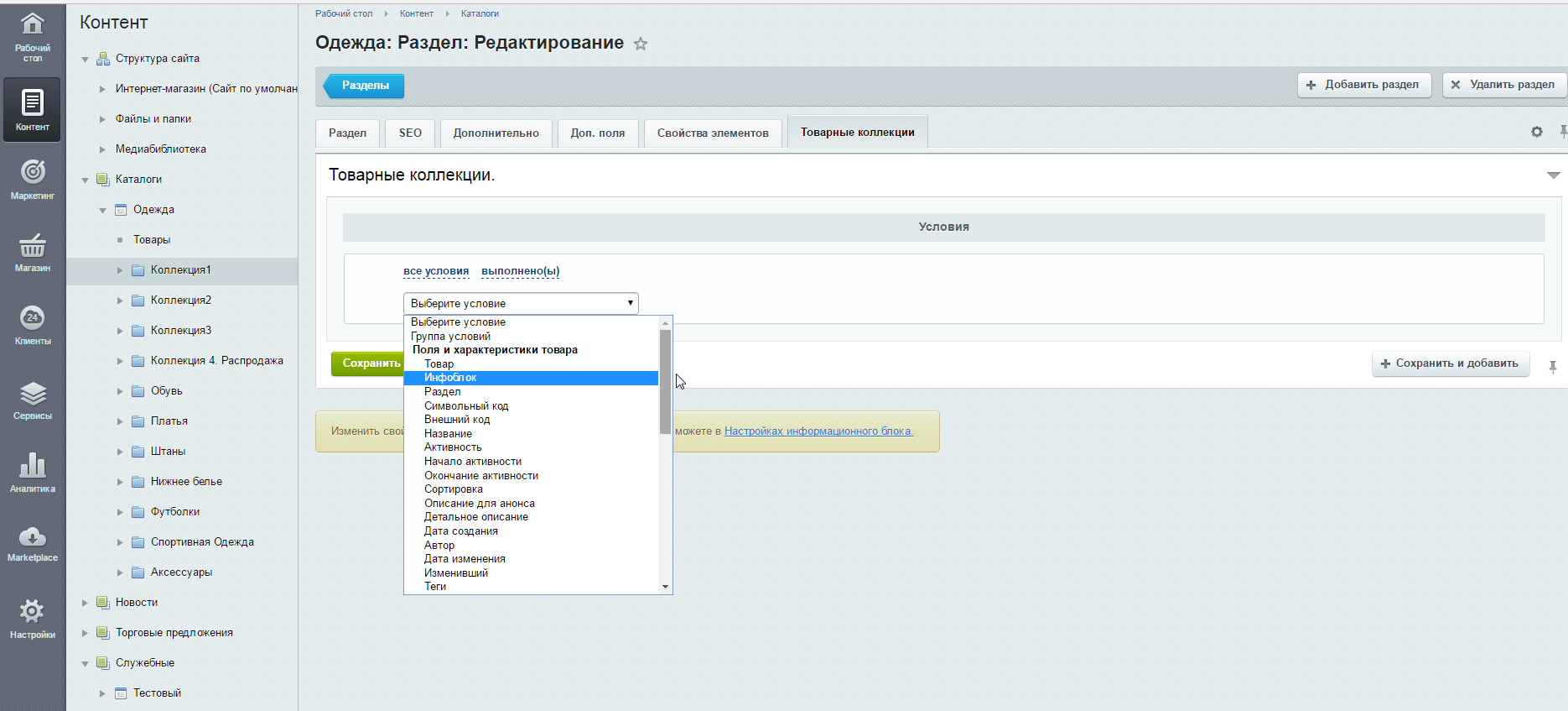 В данной вкладке производятся все настройки по коллекции: доступны конструкторы условий для подбора товаров и дополнительные опции. Важно: