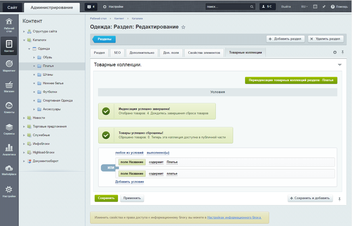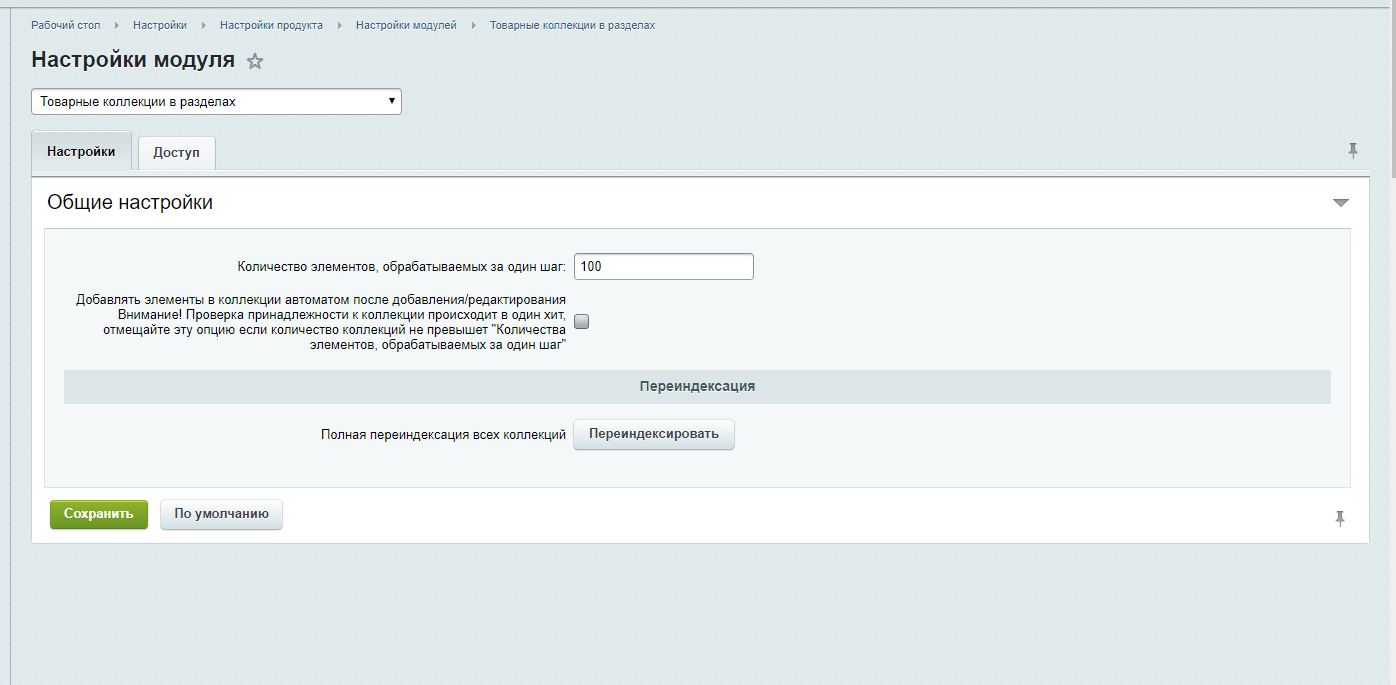 | Для привязки товаров к разделам инфоблока [разделам-коллекциям] необходима переиндексация. При переиндексации происходит привязка товаров к категориям инфоблока, но при этом они также останутся привязанными к своим старым разделам, для которых не настроена коллекция. Переиндексацию коллекции необходимо проводить только один раз после ее создания или изменении условий. // | ||||