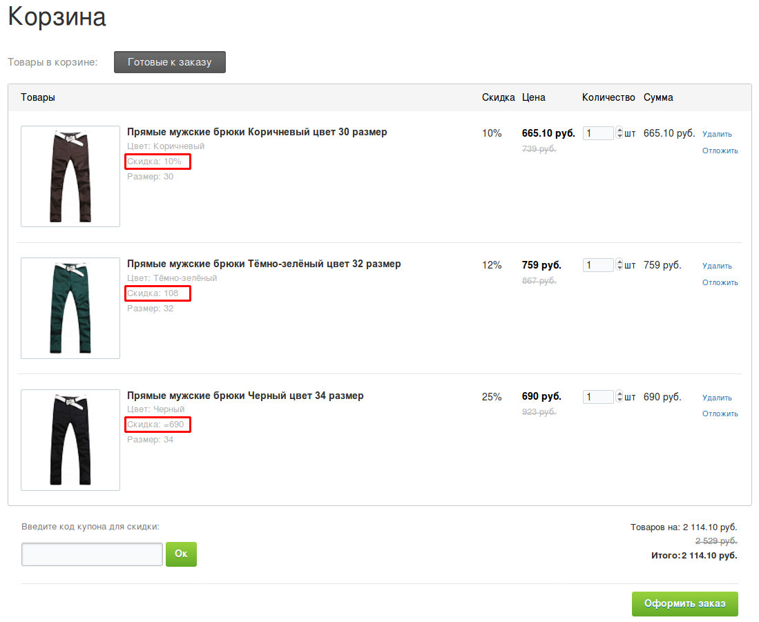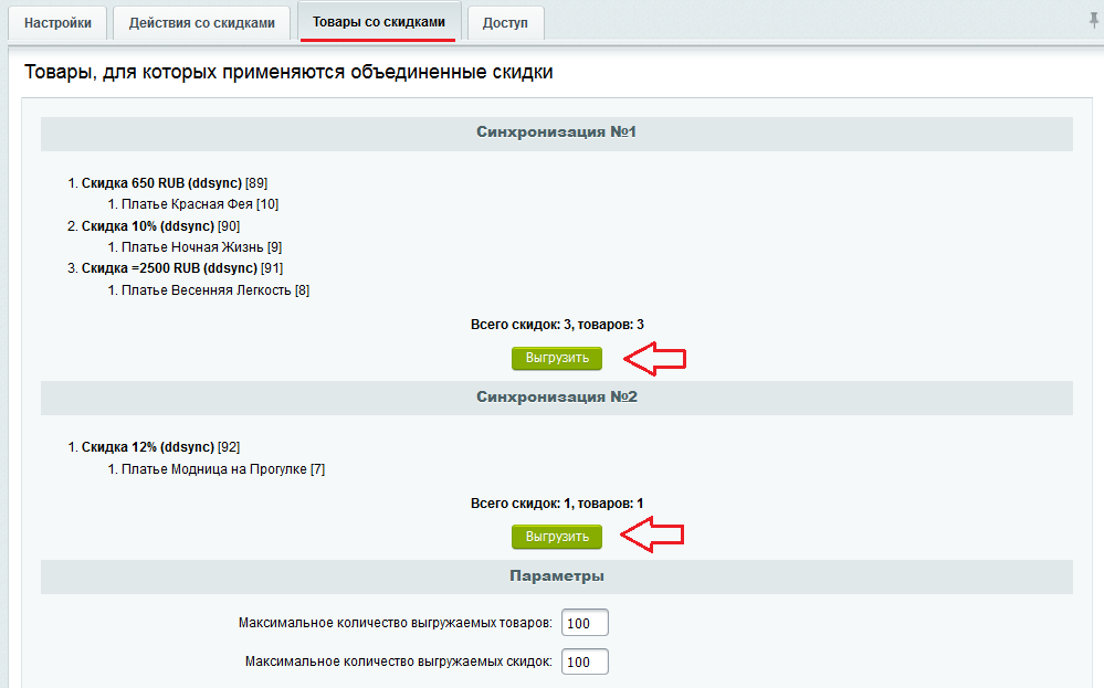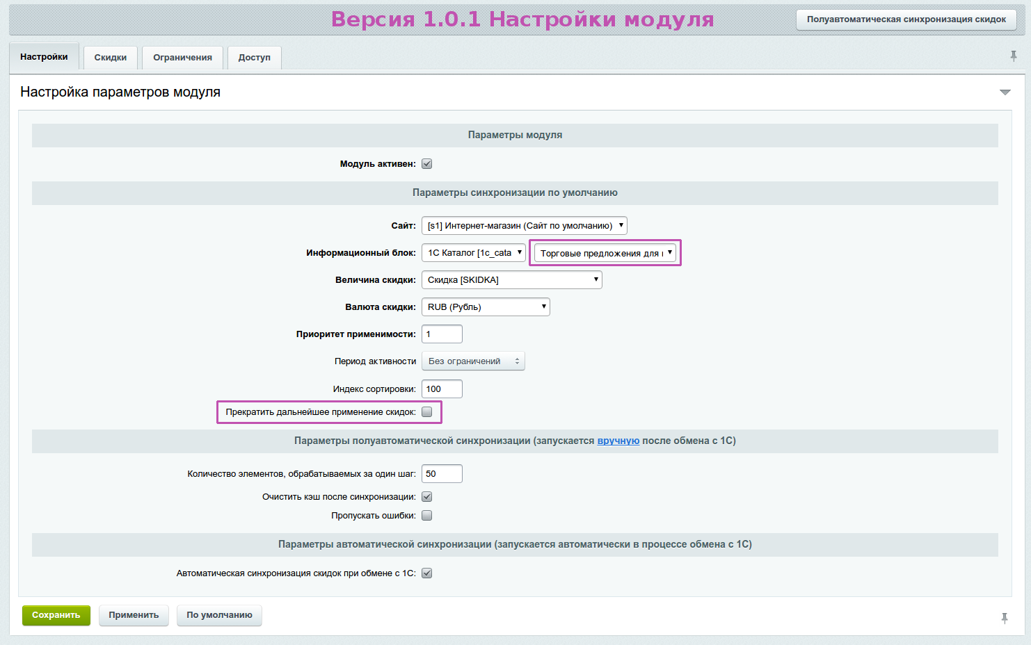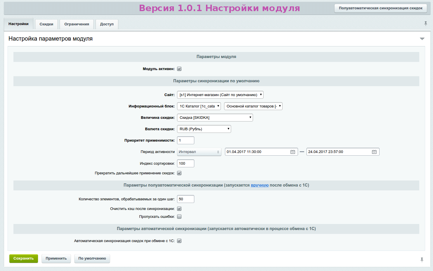 - Автоматическая синхронизация скидок. Скидки автоматически создаются на сайте после обмена с 1С;
