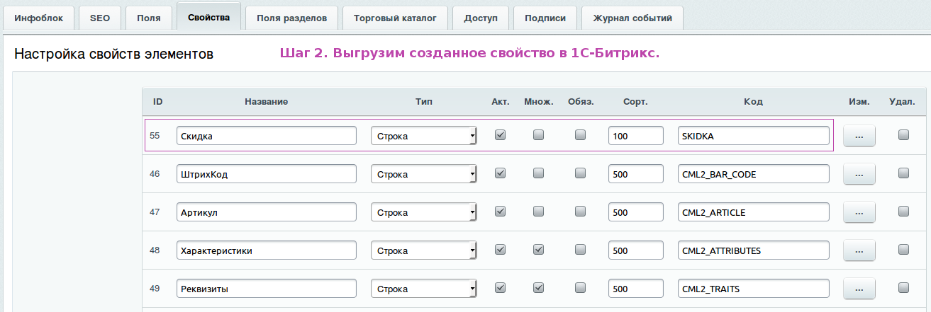- Полуавтоматическая синхронизация скидок. Скидки в данном случае автоматически не создаются после обмена с 1С. В настройках модуля на сайте необходимо дополнительно запустить генерацию скидок по свойству товара, которую нам подгрузил 1С. Сделано с целью разделения логики обмена с 1С и генерации скидок в 1С-Битрикс.