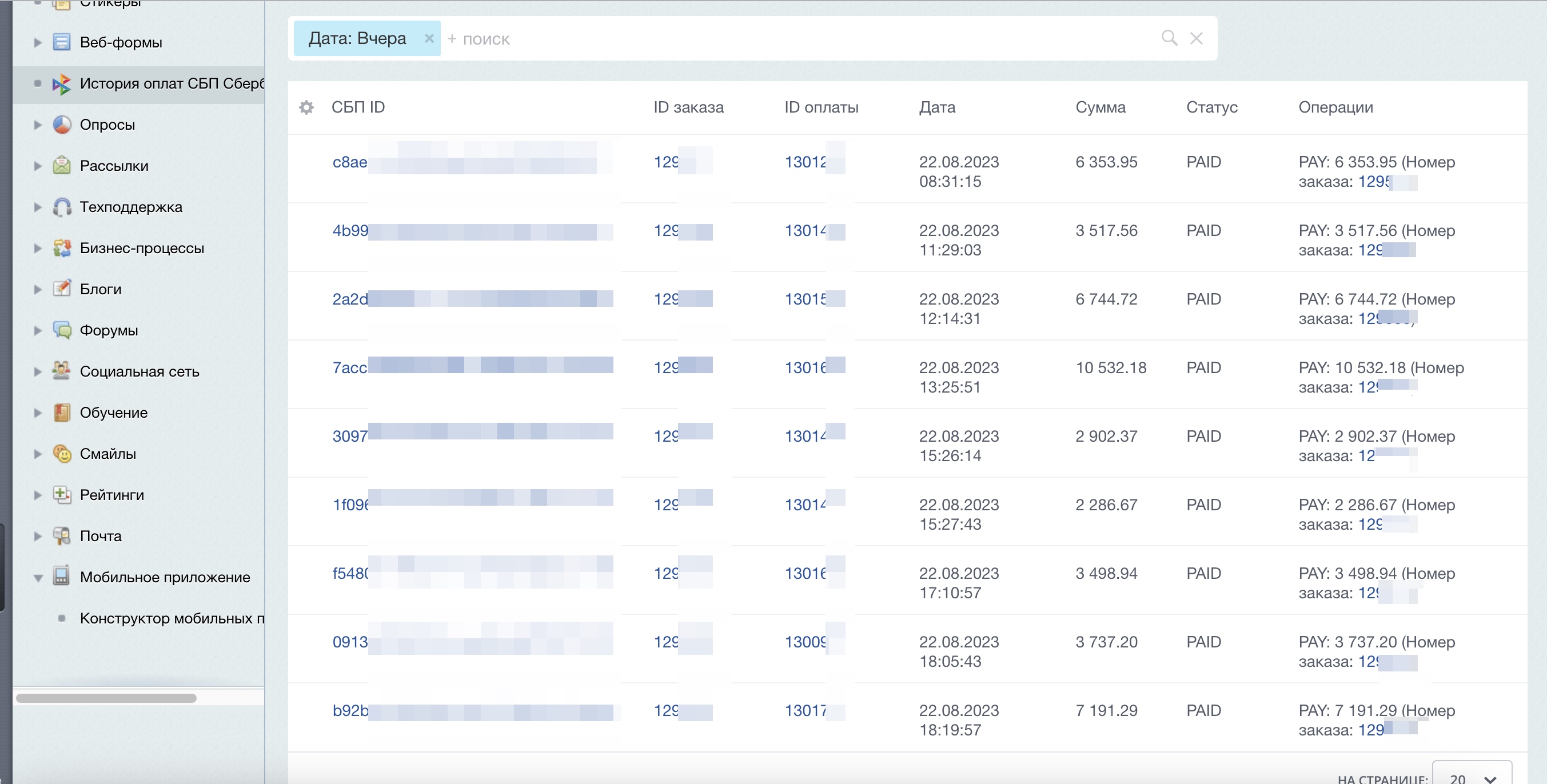 - имеет возможность просмотра истории оплат с просмотром детальной информации о каждой оплате (Сервисы - История оплат СБП Сбербанк).