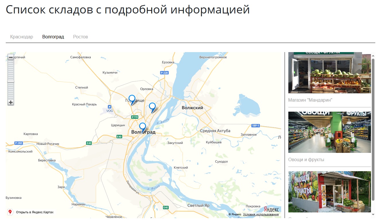 - Размещение складов на Яндекс Карте по указанным координатам в виде меток;
