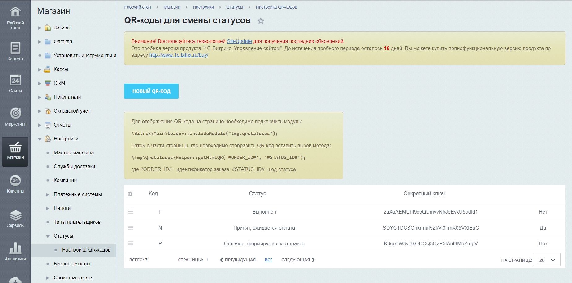 Например, у Вас используется своя доставка товаров покупателям и сразу после доставки необходимо сменить статус заказа на "Доставлен". Для этого на бланк заказа (подробнее https://dev.1c-bitrix.ru/user_help/store/sale/orders/sale_order_print.php) устанавливается QR-код на статус "Доставлен", и как только курьер доставит заказ, он считывает данный QR-код любым приложением для считывания QR-кодов, переходит по ссылке, которая "зашита" в QR-код и статус заказа в магазине сменится.