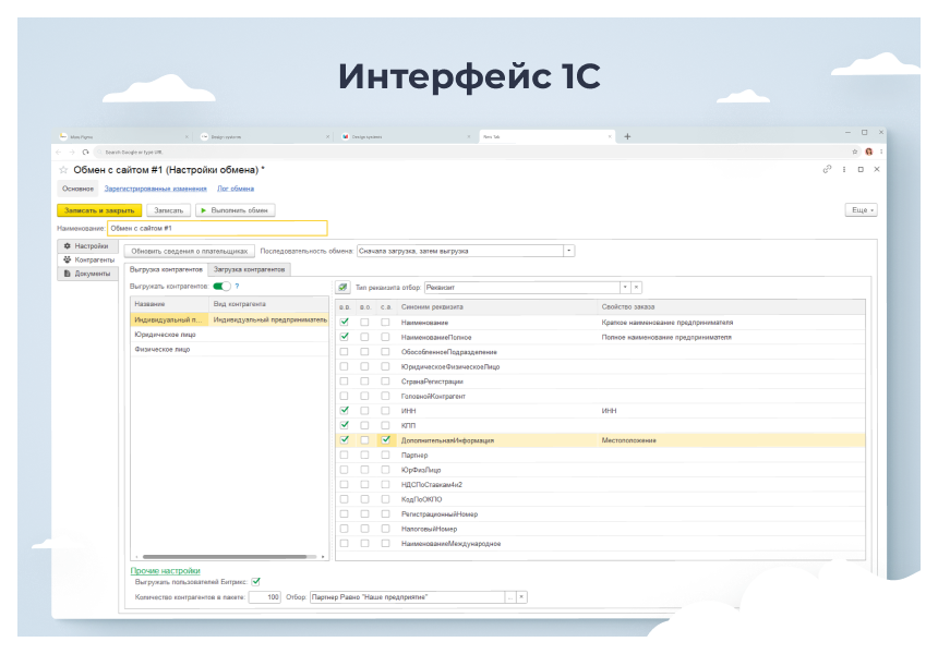 интеграцию между 1С и Битрикс. Он добавляет обмен организациями и пользователями с