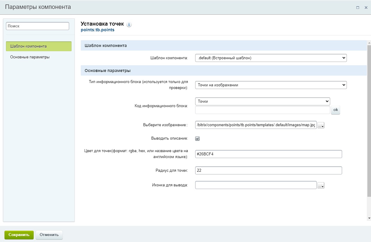 В настройках компонента можно задать размер и цвет точек, или загрузить иконку.