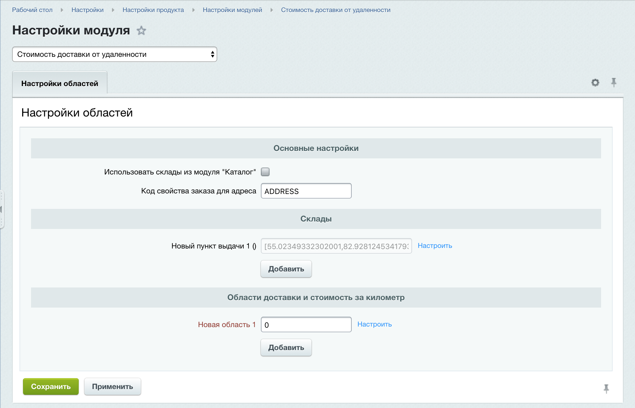 - В настройках модуля можно указать свойство заказа, куда будет записана информация о выбранной пользователем точки. Создайте свойство типа "Строка" для заказа. В этом свойстве указывается "Название склада", "Адрес точки" и "Координаты точки";