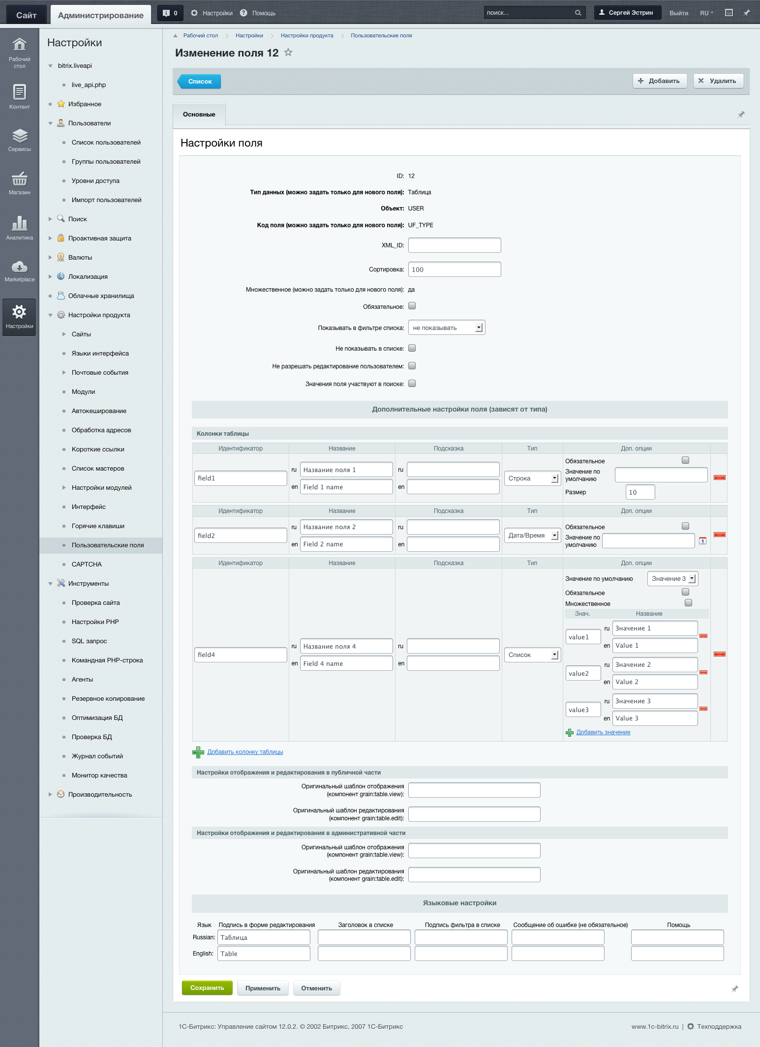 - Для создания поля типа "Таблица", например, у пользователей, с возможностью редактирования пользователем через стандартный компонент профиля (программирование при этом не требуется). Пример: свойство "Места работы" у пользователя, где для каждого места работы можно задать несколько параметров.