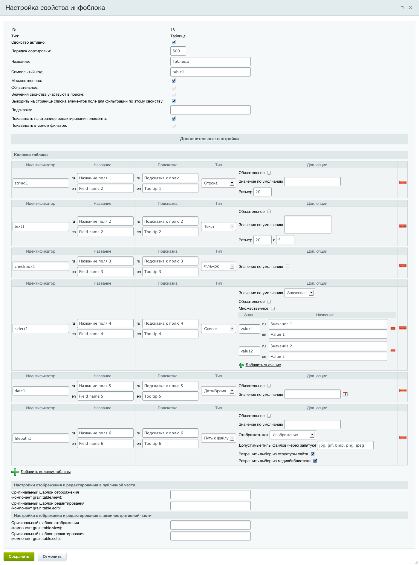 - 8 возможных типов данных для каждой колонки таблицы: Строка, Текст, Флажок, Список (в т.ч. множественный), Дата/Время, Путь к файлу (с возможностью выбора из медиабиблиотеки и структуры сайта), Файл (загружаемый), Привязка (доступен при наличии модуля Универсальные свойства привязки)