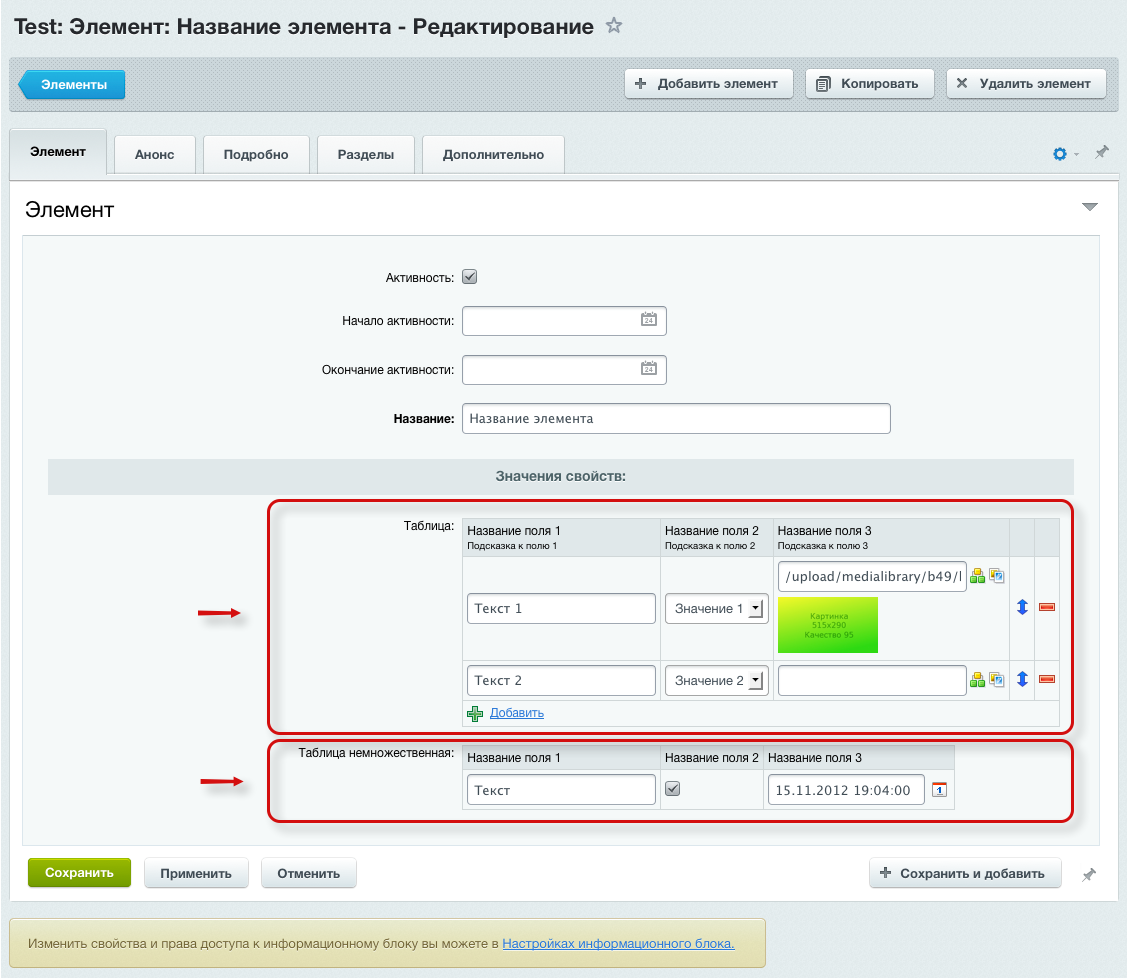 - Для вывода таблиц у элементов инфоблоков (новостей, статей и пр.) в публичной части сайта без необходимости правки шаблонов компонентов