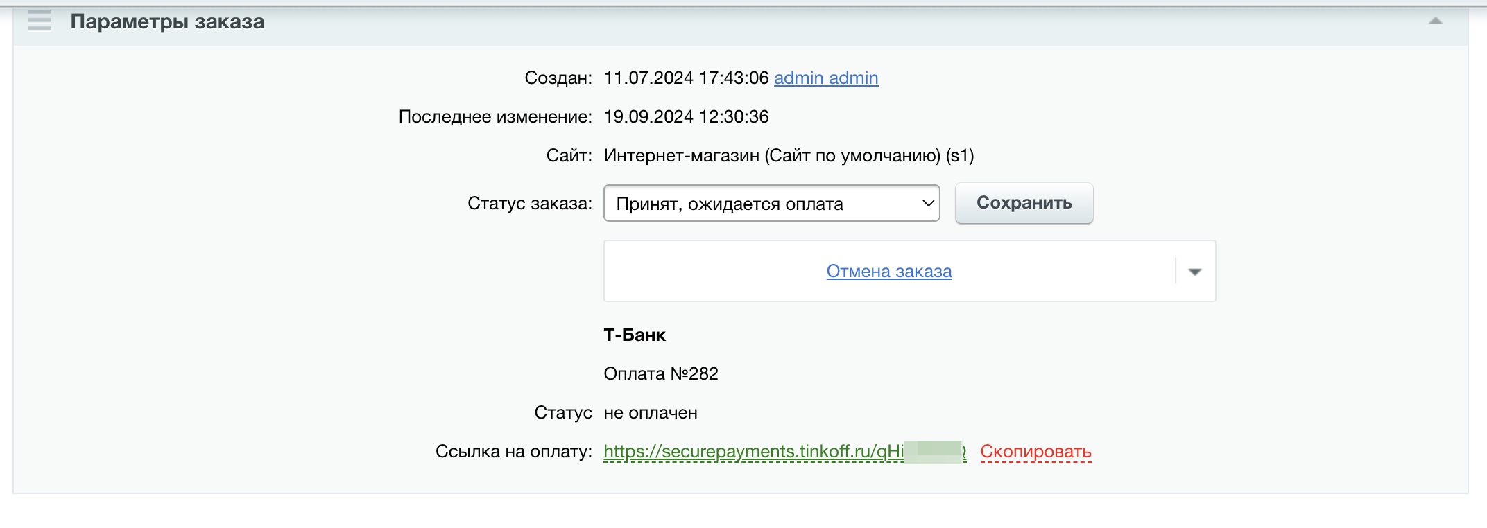 - возможность генерировать ссылку оплаты прямо из административной части заказа;