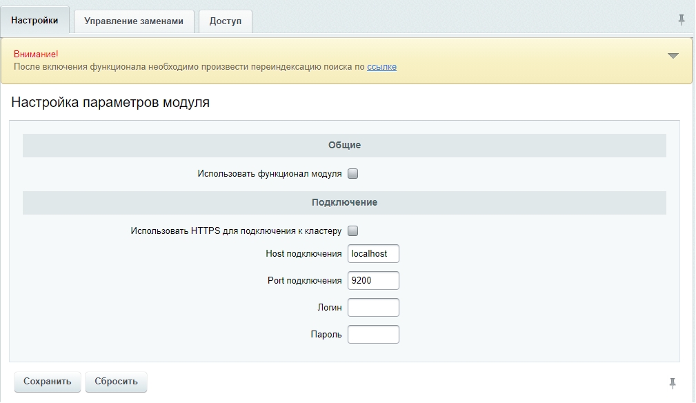 Данный модуль будет корректно функционировать только если на сервере вашего сайта уже установлен движок поиска ElasticSearch.