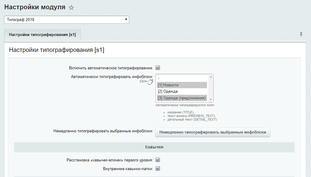 - Автоматическое типографирование заголовка, превью и детального текста при добавлении/редактировании элементов выбранных инфоблоков для каждого сайта.