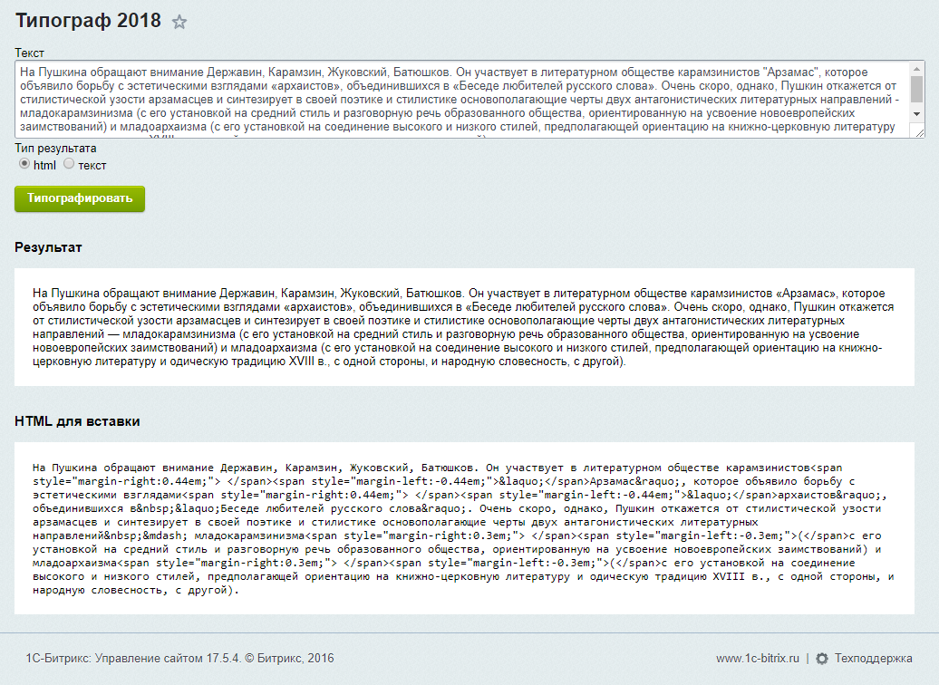 - Типографирование в новом визуальном редакторе выбранного участка или всего текста целиком.