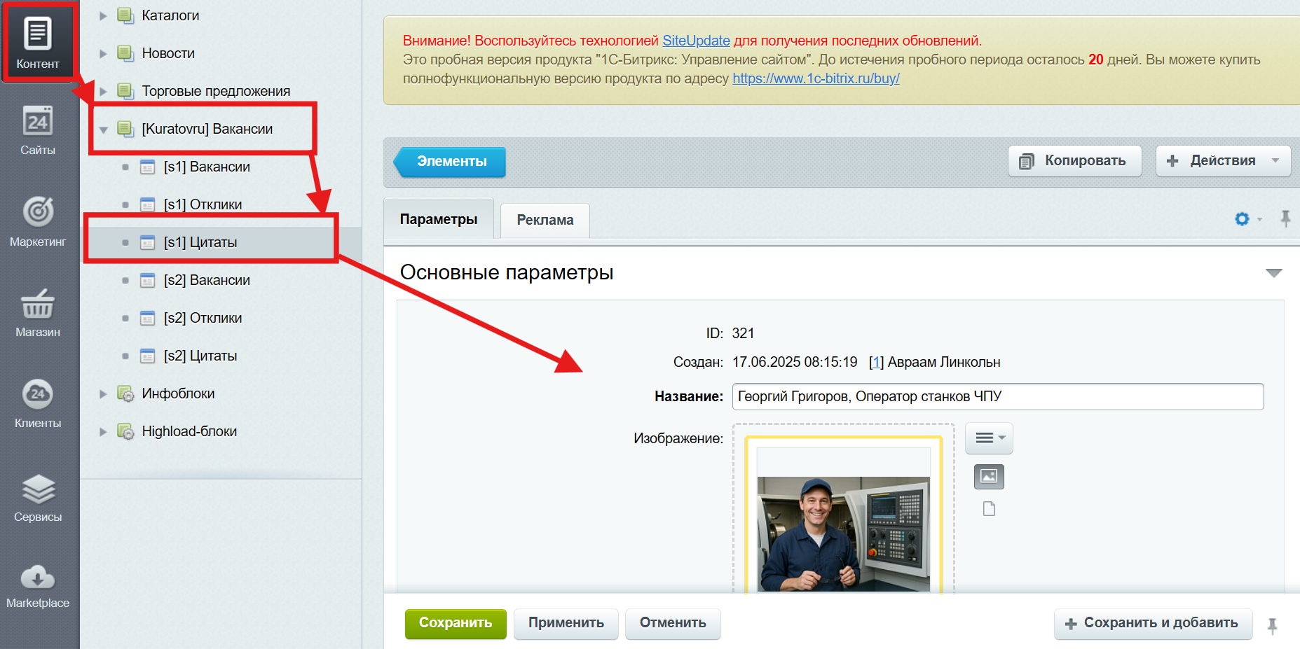 Описание инфоблоков модуля После установки модуля в административной части сайта будут доступны инфоблоки позволяющие работать с содержимым раздела “Вакансии”. Для каждого сайта, которому в настройках модуля установлены и сохранены необходимые параметры, будут инсталлированы три инфоблока (“Цитаты”, “Ваканси”, “Отклики”. Работа с инфоблоком “Цитаты” Блок “Цитаты” предназначен для демонстрации корпоративной культуры и ценностей компании через живые цитаты действующих работников. Каждый отзыв сопровождается именем, должностью и отражает личные впечатления от работы в компании: возможность карьерного роста, гордость за профессию, значимость своей деятельности. Такой блок усиливает доверие соискателей, делает страницу более человечной и способствует положительному восприятию работодателя. |