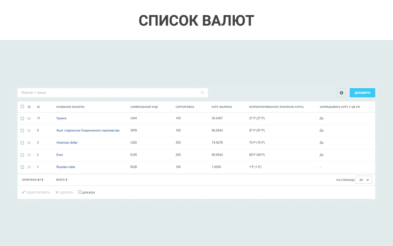 Решение позволяет хранить информацию о стоимости товаров/услуг в иностранной валюте и отображать их конвертированное значение в основной валюте на сайте. Для данных валют устанавливается курс по отношению к основной валюте (руб.).