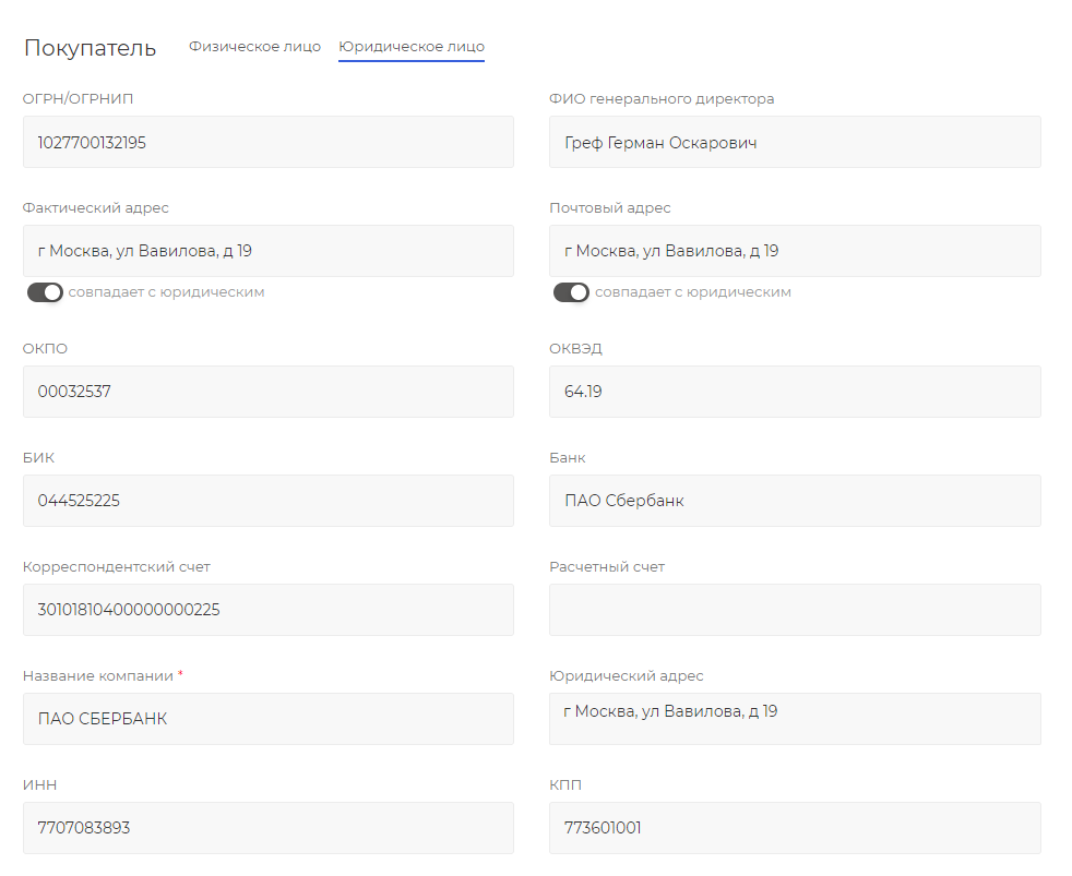 - Автоматическое заполнение реквизитов: Модуль автоматически заполняет такие поля, как ИНН, БИК, КПП, ОГРН и другие, используя актуальные данные из официальных источников.