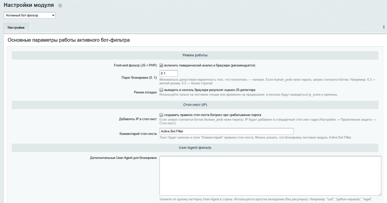Модуль защищает сайт на 1С‑Битрикс от ботов, скриптов накрутки и автоматизированного спама.