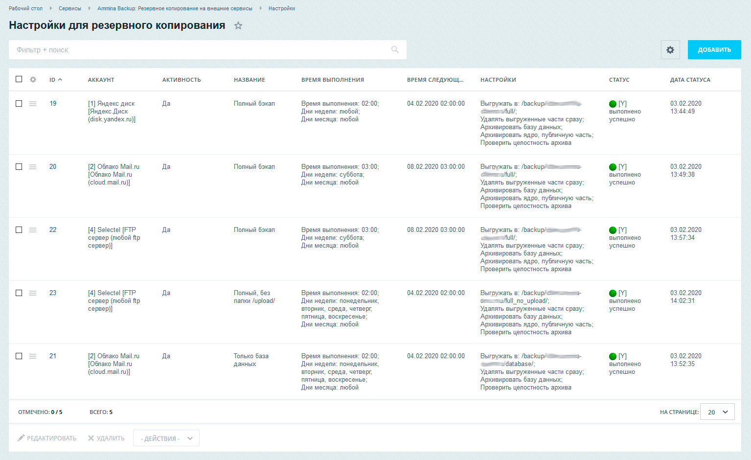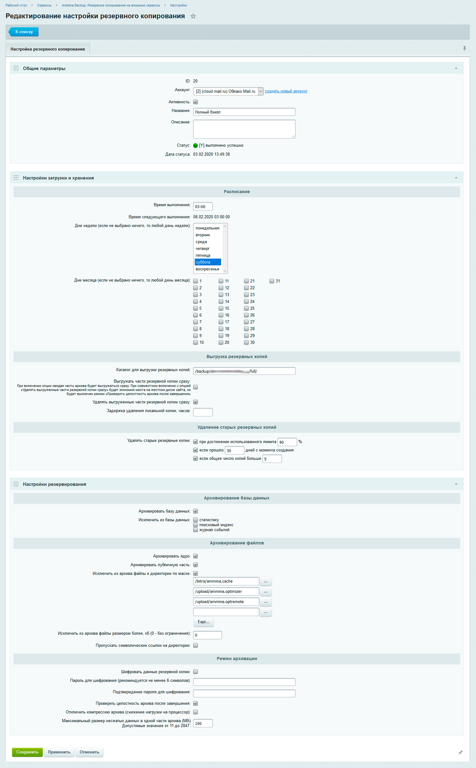 Например, можно включить полное резервное копирование каждый день в определенное время, либо сделать 2 настройки: полное резервное копирование по субботам и ежедневное резервное копирование базы данных. Количество настроек не ограничено и позволяет создать необходимую схему резервного копирования сайта.
