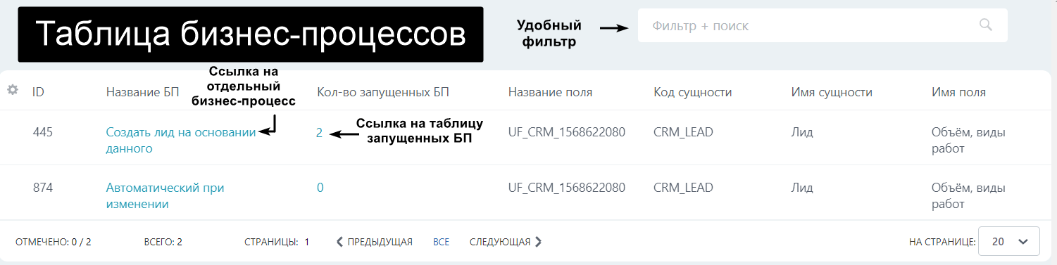 Таблица бизнес-процессов: позволяет перейти к носителю, в котором запущен бизнес-процесс, или к шаблону бизнес-процесса, где можно изменить процесс и увидеть активити, содержащие пользовательское поле.