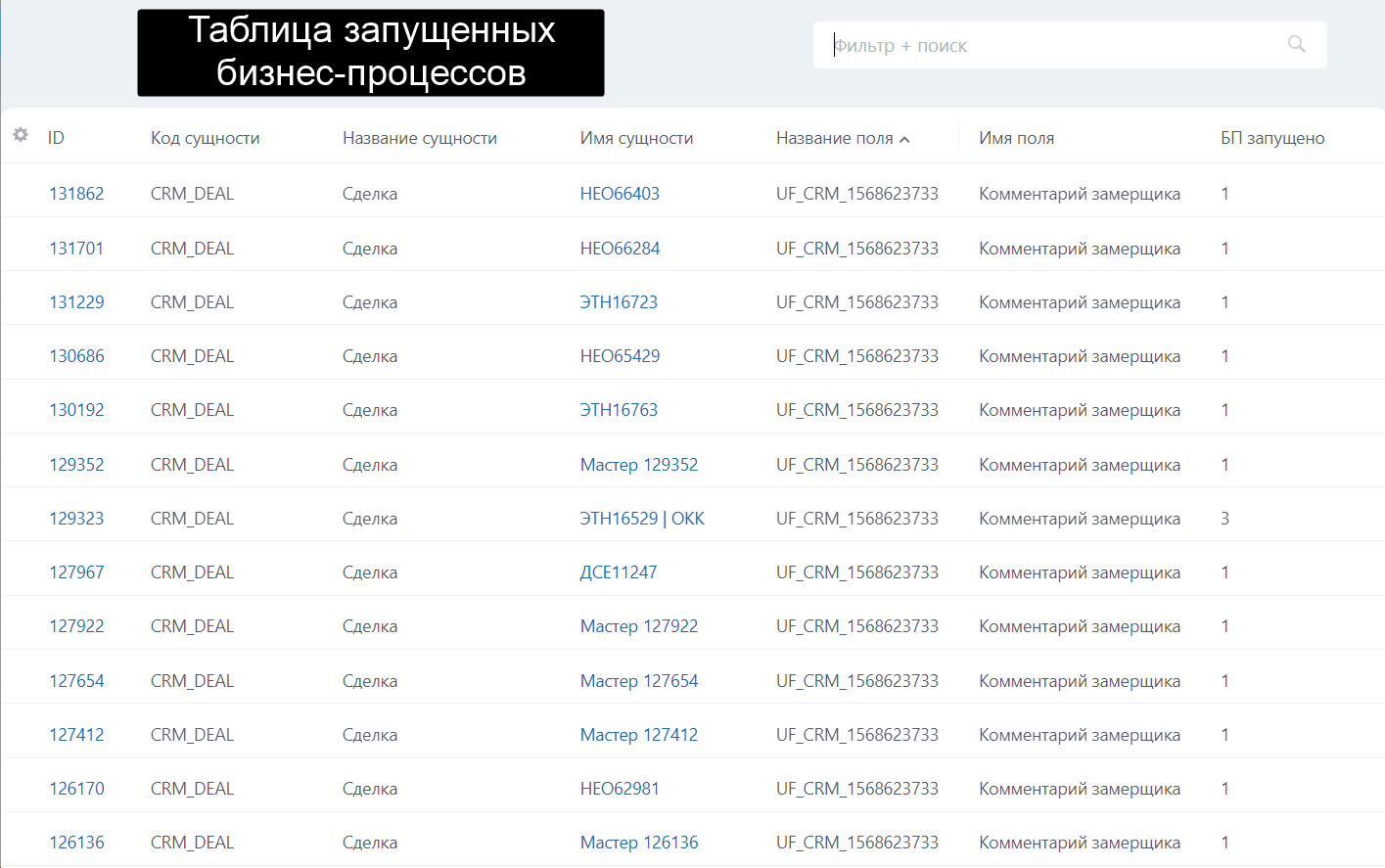 Анализ использования пользовательских полей в бизнес-процессах: модуль предоставляет информацию о бизнес-процессах, в которых используются пользовательские поля, включая активные и запущенные в данный момент процессы. Это позволяет лучше понимать взаимосвязи между полями и процессами, а также их влияние на эффективность работы CRM.