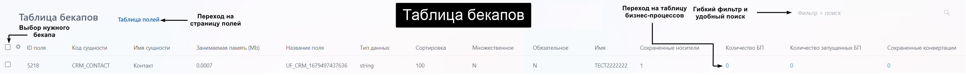 Таблица бекапов: позволяет перейти к таблицам бизнес-процессов, восстановить удаленные поля или окончательно удалить их.