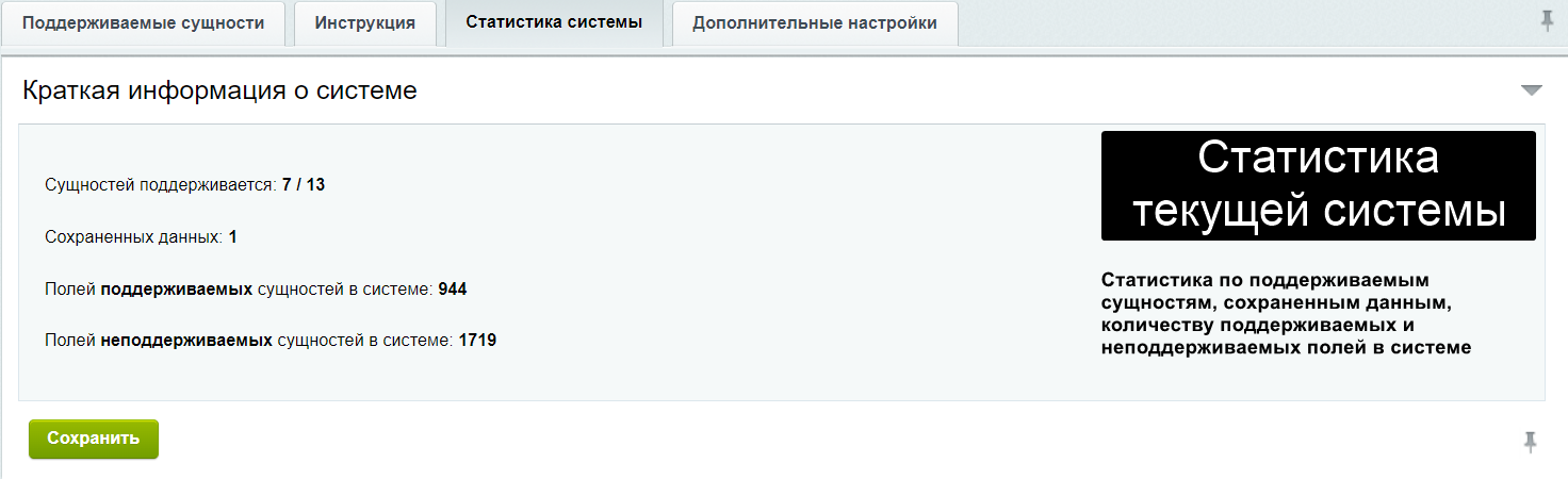 Статистика текущей системы: модуль предоставляет статистику по поддерживаемым сущностям, сохраненным данным, количеству поддерживаемых и неподдерживаемых полей в системе.