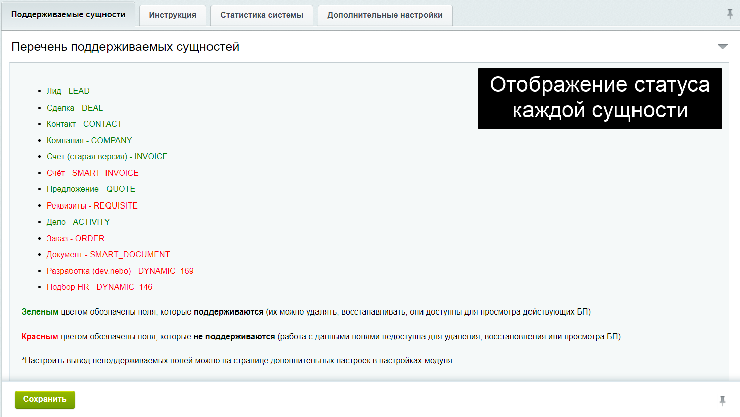 Отображение поддерживаемых и неподдерживаемых сущностей: модуль показывает статус каждой сущности (Лид, Сделка, Контракт, Компания и т.д.) с помощью зеленого и красного цветов. Зеленый цвет обозначает поддерживаемые сущности, доступные для удаления, восстановления и просмотра бизнес-процессов, в то время как красный цвет обозначает неподдерживаемые сущности, с которыми нельзя работать. Настройка отображения неподдерживаемых полей доступна на странице дополнительных настроек в настройках модуля.
