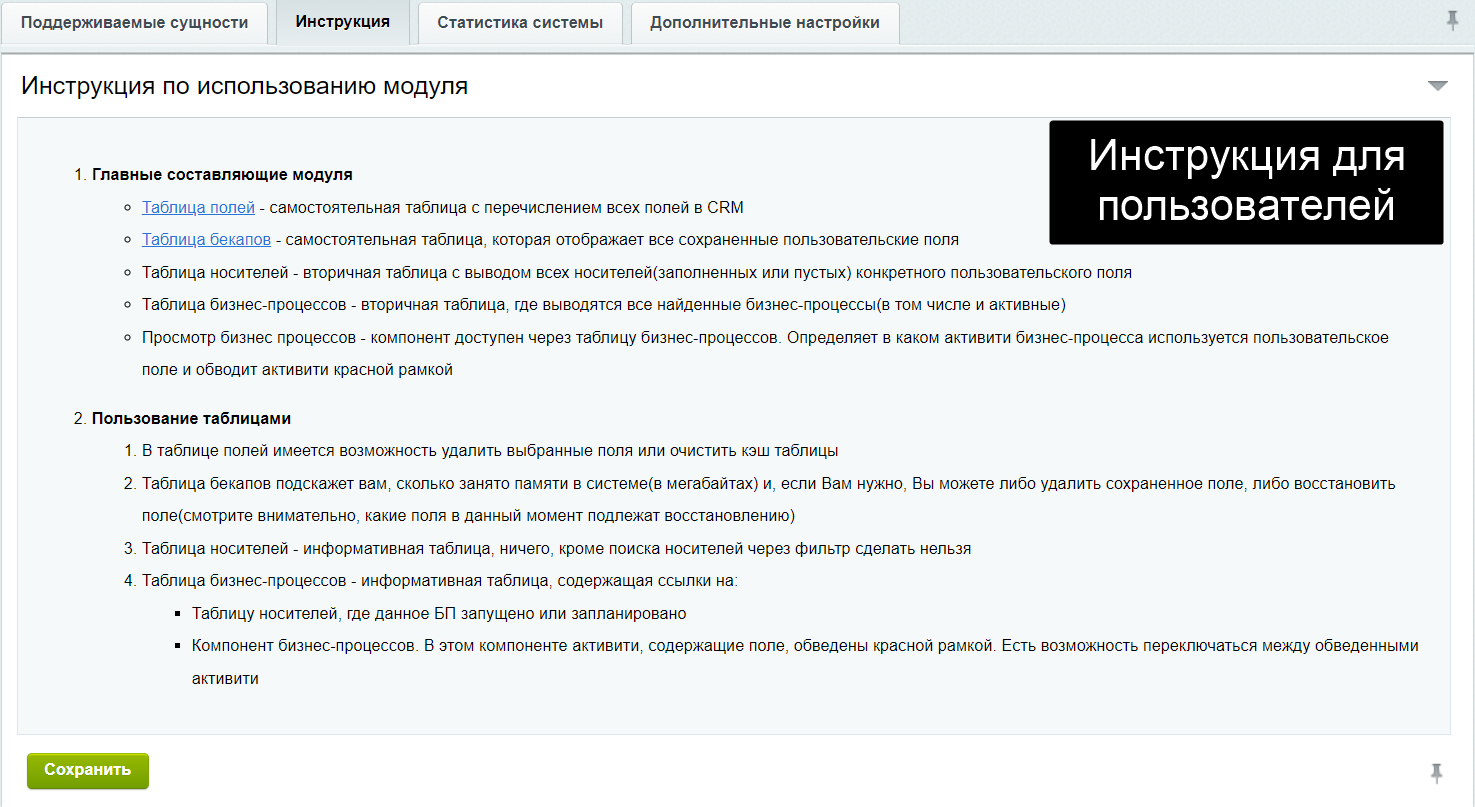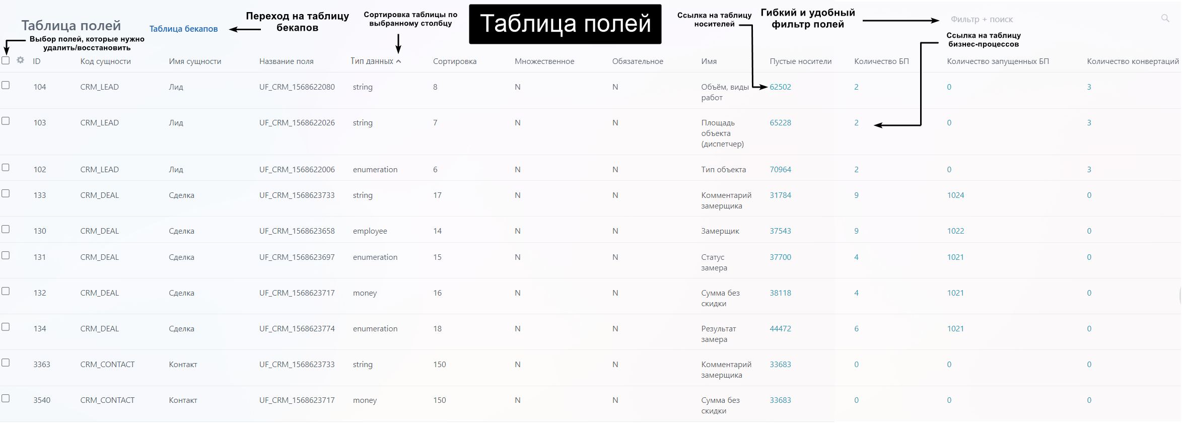 Просмотр носителей пользовательских полей: модуль предоставляет информацию о том, какие объекты CRM (лиды, сделки, контакты и т.д.) содержат заданные пользовательские поля. Это позволяет определить область применения полей и проанализировать их эффективность.