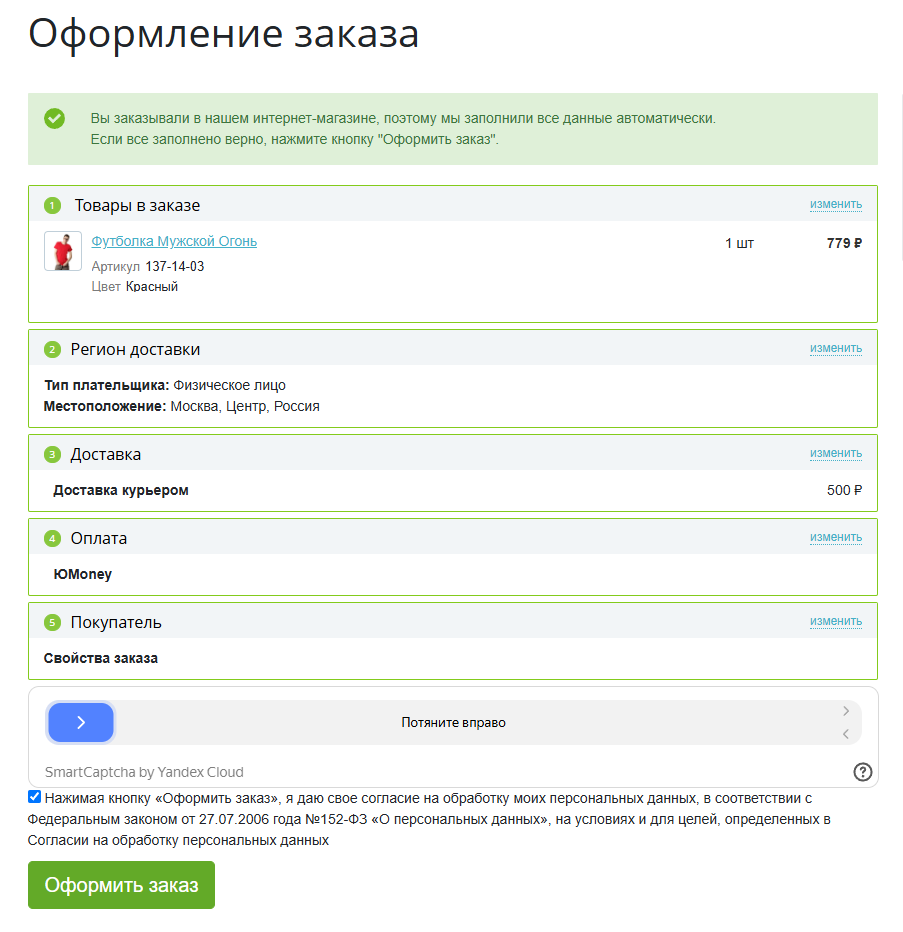 Оформление заказа в стандартном режиме выглядит следующим образом. Заполняете полностью форму по последовательным этапам: адрес, способ доставки, оплаты, данные о себе. Советуем в комментарии к заказу написать информацию, которая поможет курьеру вас найти. Нажмите кнопку «Оформить заказ».