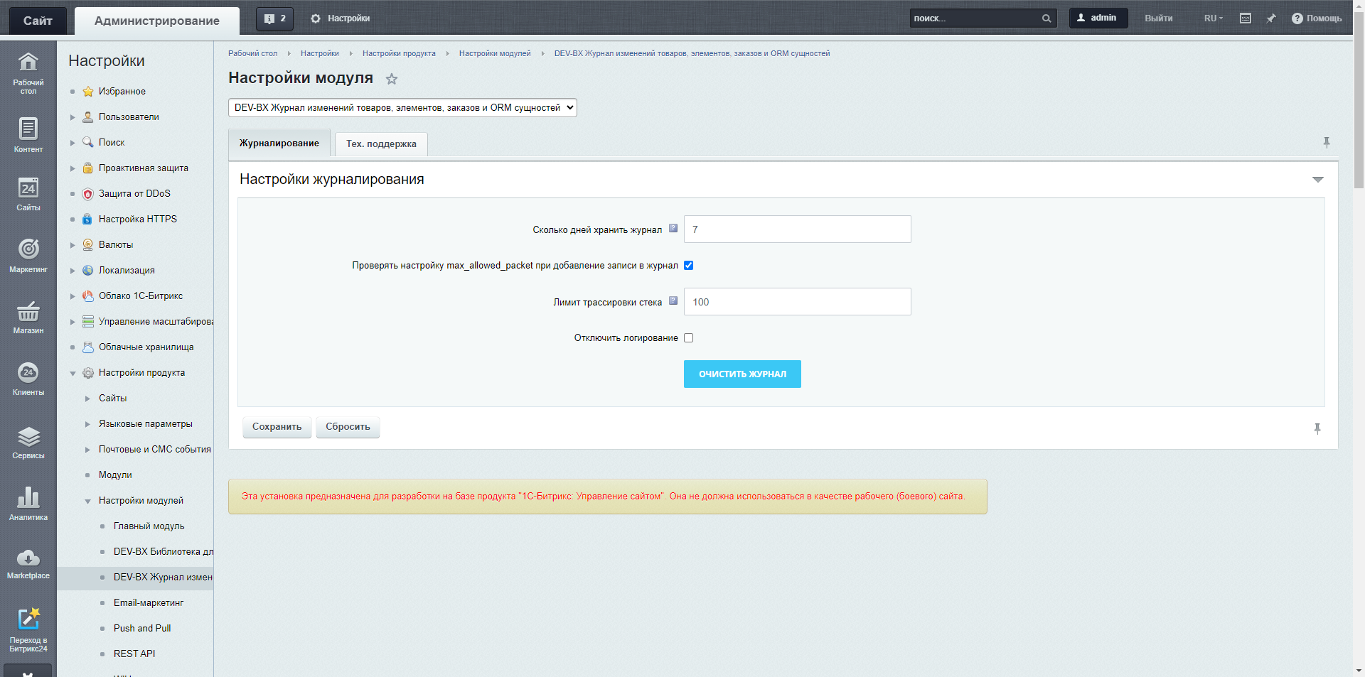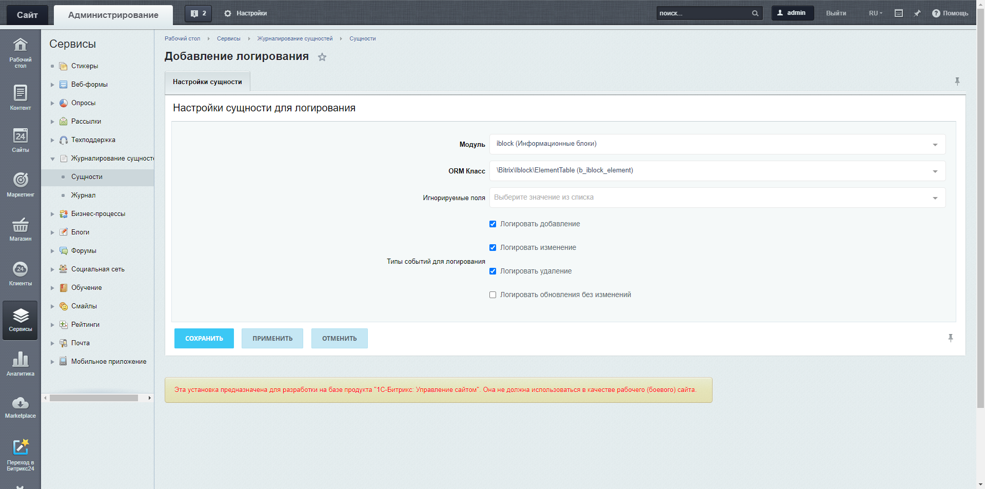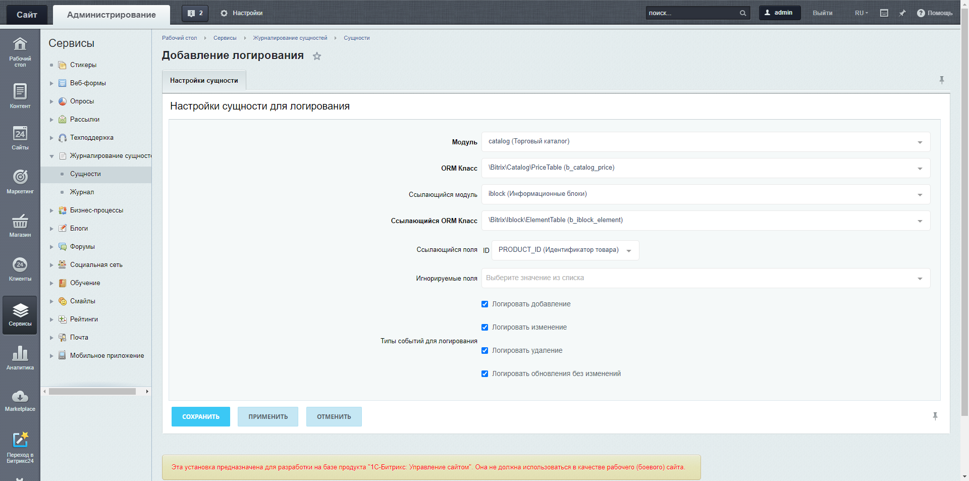Модуль позволяет записывать в журнал добавление/изменение/удаление данных ORM сущностей унаследованных от \Bitrix\Main\ORM\Data\DataManager