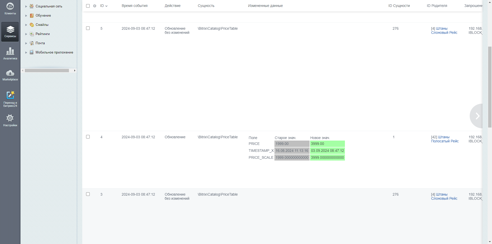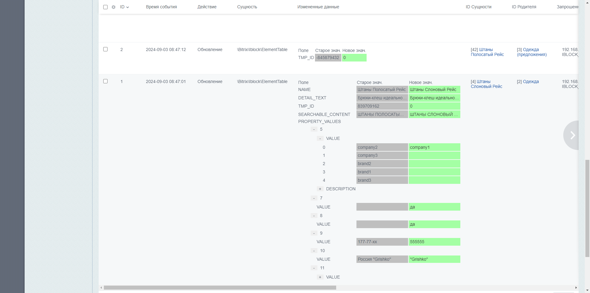В журнал записываются изменения полей и свойств элементов, а для разделов поля и “пользовательские поля”.