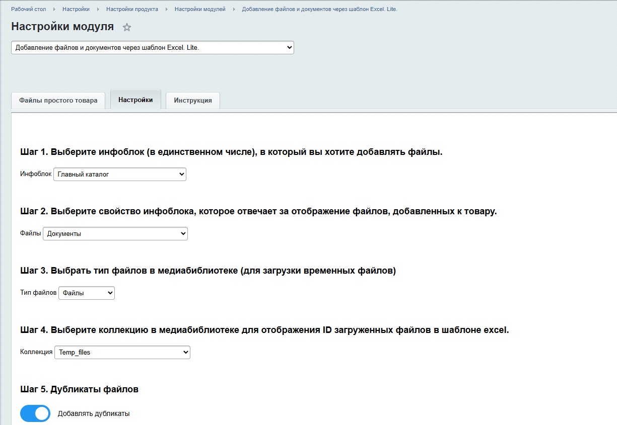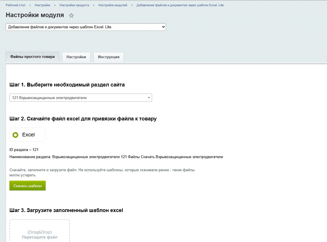 Пользователь самостоятельно выбирает свойство инфоблока, в который будут добавляться файлы и документы при загрузке шаблона excel.