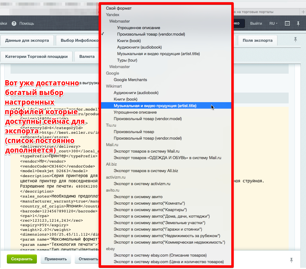 - более 40 предварительно подготовленных шаблонов работы с порталами что позволяет минимальными усилиями очень быстро найти новые ниши и рынки сбыта (например агрегатор Lengow объединяет в себе сотни торговых европейских площадок, что дает колоссальный толчок развития бизнеса а поддержка динамического ремаркетинга и динамических объявлений пока вообще уникальный функционал на маркете)