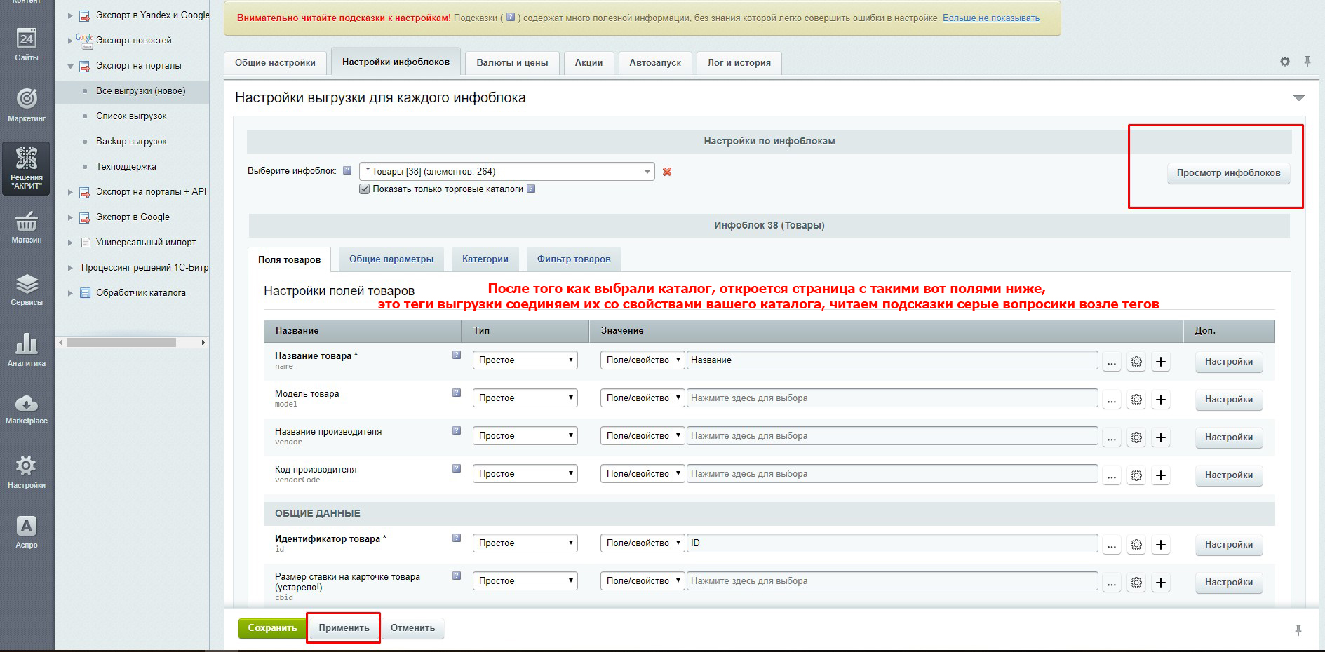 1). Для начала нужно пройти несколько простейших шагов первоначальной настройки, мы тщательно проработали интерфейс модуля который подробно описывает каждый шаг настройки (на скриншотах вы можете оценить удобство и простоту интерфейса), в следствии чего даже новичку будет не сложно потратив несколько минут сделать профессиональную выгрузку информации даже для самых придирчивых ресурсов (на данный момент это Яндекс и Гугл) и предоставить корректную информацию для заполнения. (можете убедиться в простоте шагов в приложенных скриншотах - с пошаговым объяснением действий).