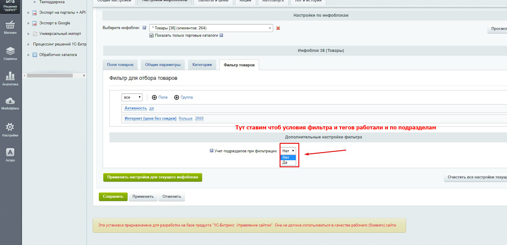 - возможность детализации настройки выгрузки до конечных подразделов каталога