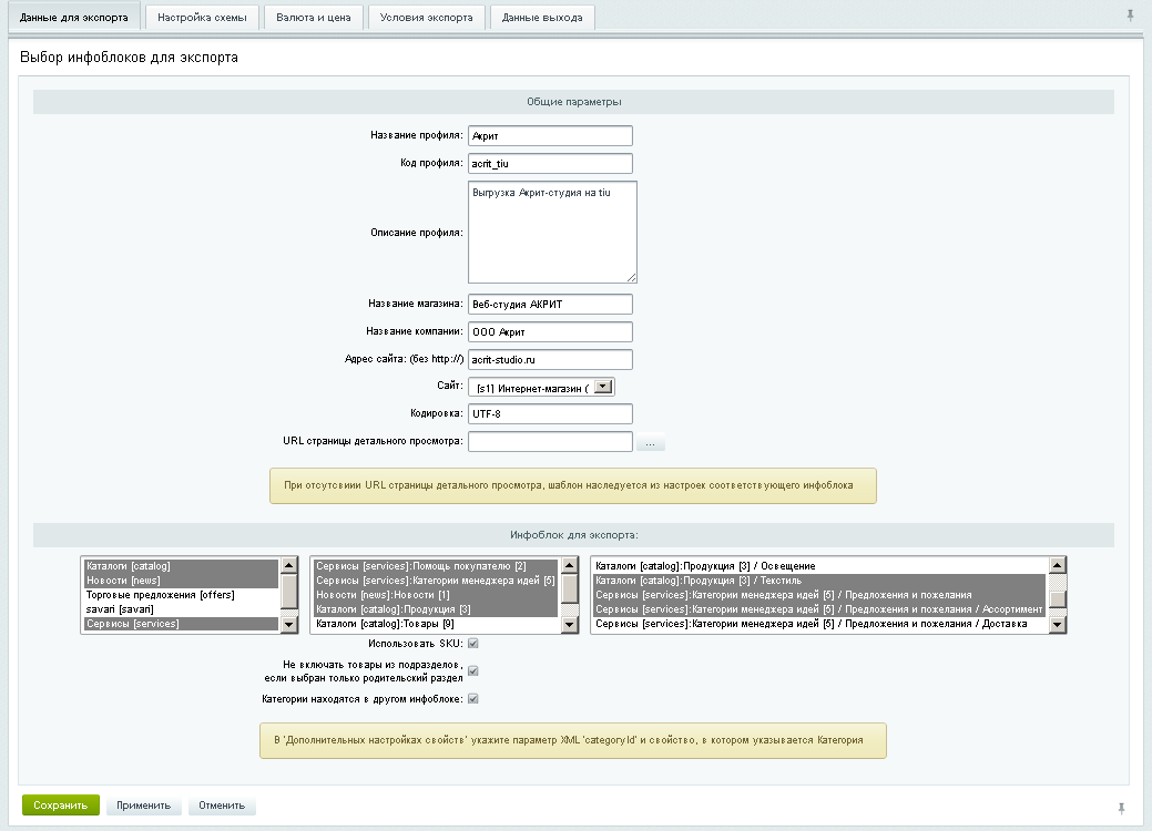 - возможность детализации настройки выгрузки до конечных подразделов каталога