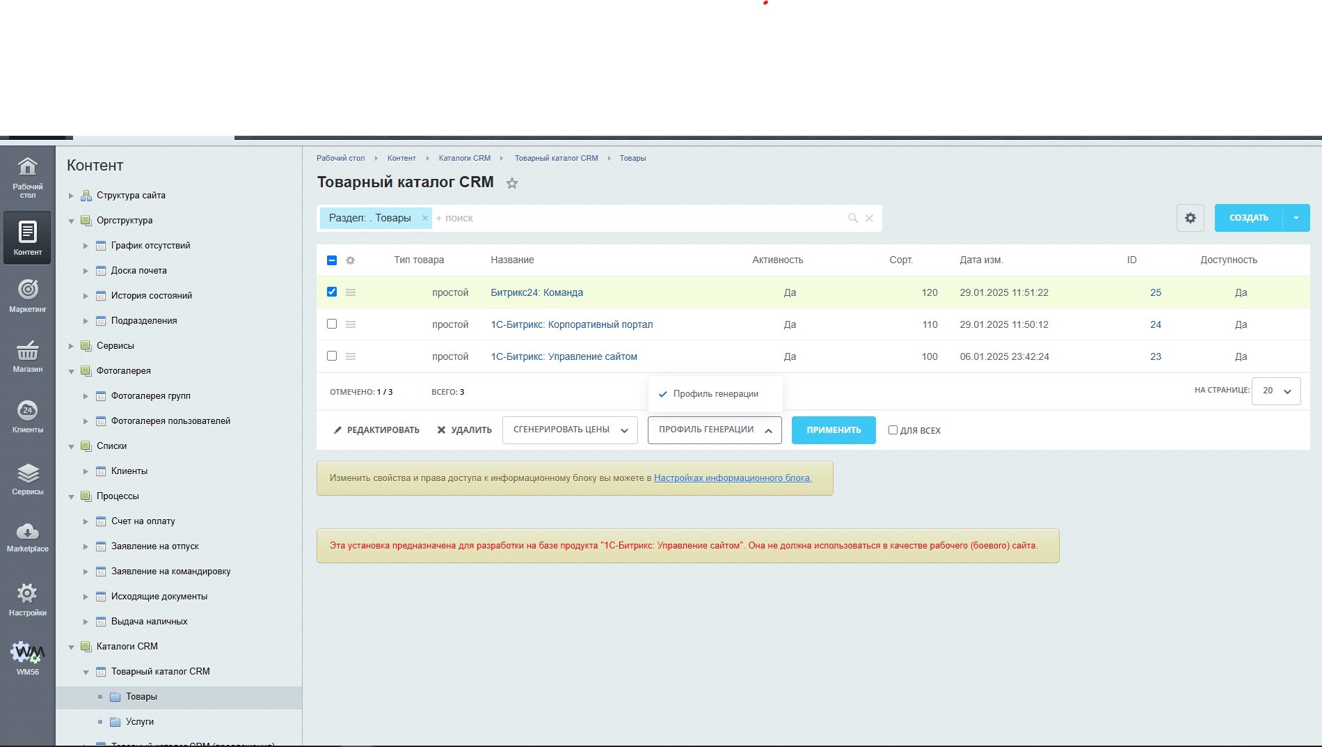 Массовая генерация цен: Выбор товаров осуществляется в списке товаров, после чего можно запустить генерацию для всех выбранных позиций.